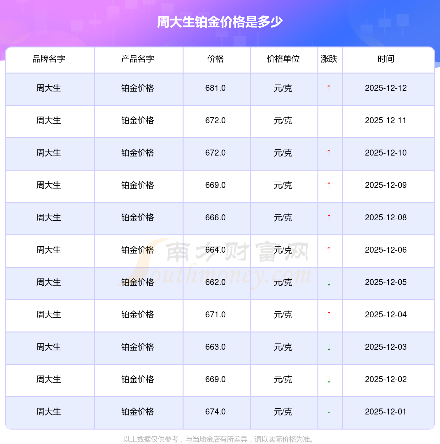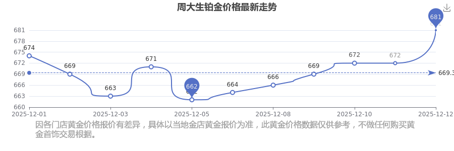 周大生 铂金价格于今日的最新挂牌价为681.0元/克。