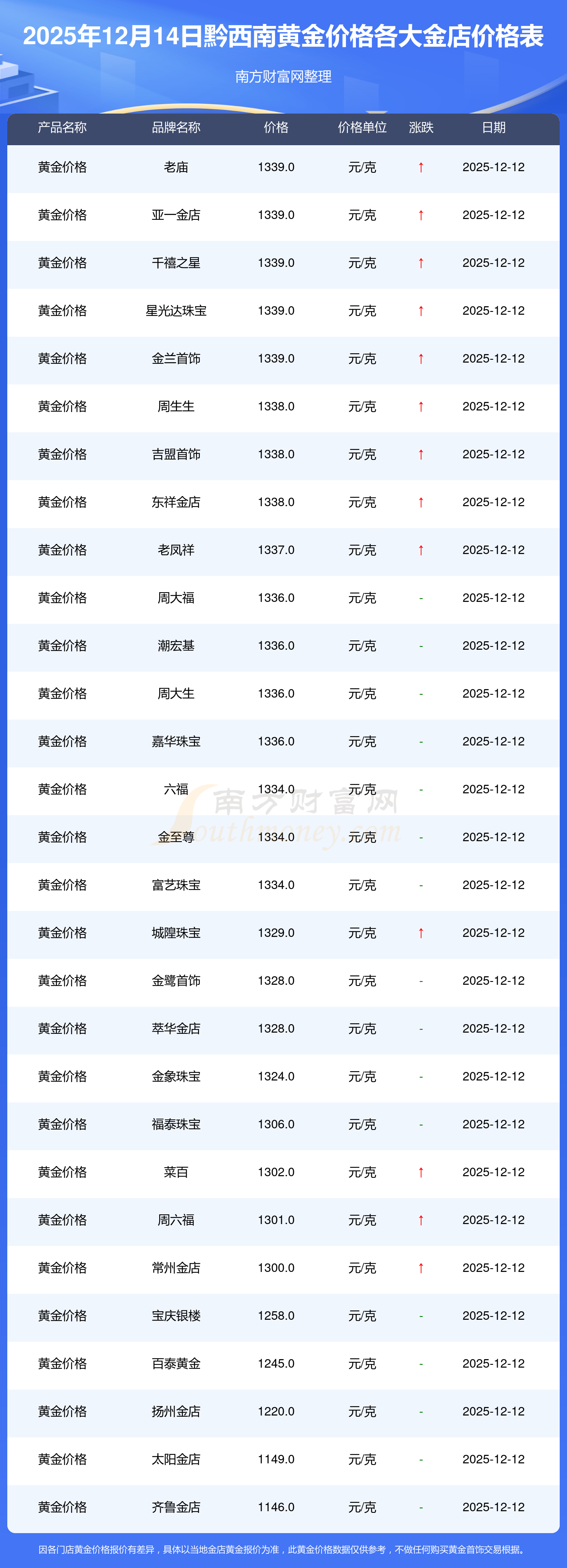 2025年12月14日黔西南周大福、周大福、老凤祥、老凤祥、老庙、老庙、周生生、周生生、周大福、周大福、周大福等各大金店品牌黄金价格最新价格行情来了,如下:周大福黄金价格1336.0元/克,周大福铂金价格681.0元/克,老凤祥黄金价格1337.0元/克,老凤祥铂金价格650.0元/克,老庙黄金价格1339.0元/克,老庙铂金价格600.0元/克,周生生黄金价格1338.0元/克,周生生铂金价格681.0元/克,周大福饰品金价(内地)1336.0元/克,周大福黄金饰品(香港)47410.0,周大福铂金价格(香港)19550.0。