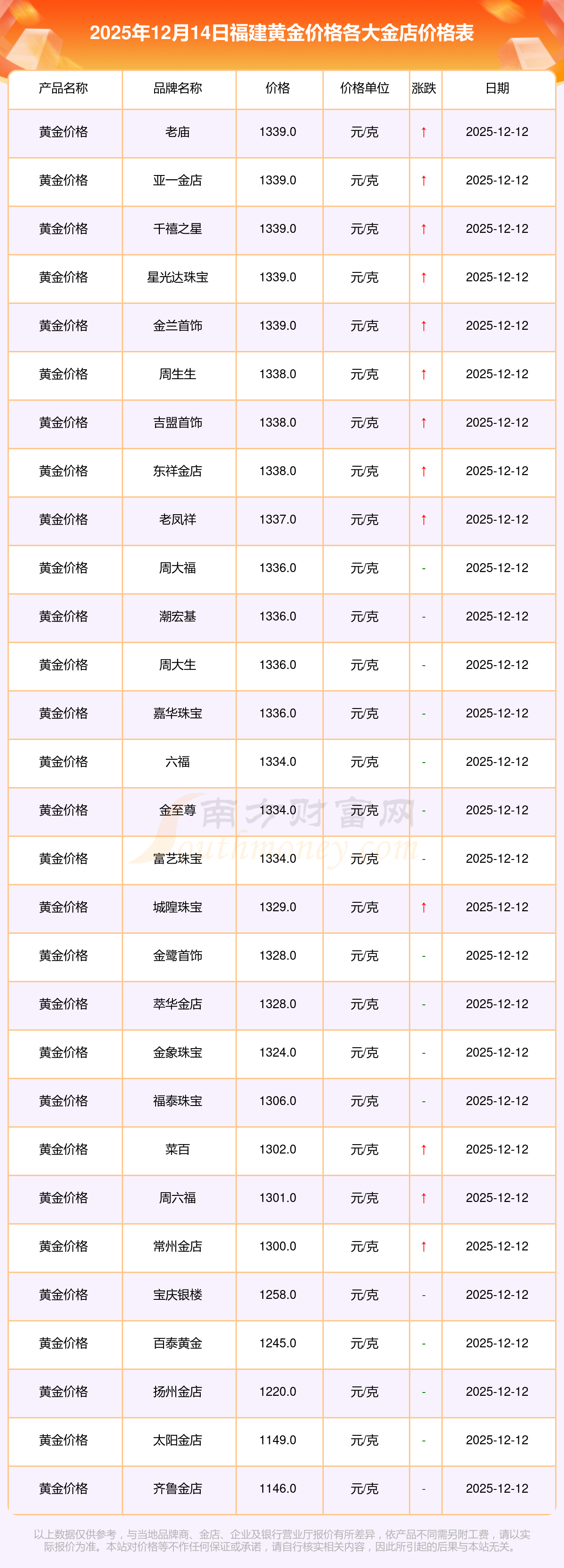2025年12月14日福建各大金店黄金价格最新价格查询来了:周大福1336.0元/克,周大福681.0元/克,老凤祥1337.0元/克,老凤祥650.0元/克,老庙1339.0元/克,老庙600.0元/克,周生生1338.0元/克,周生生681.0元/克,周大福1336.0元/克,周大福47410.0,周大福19550.0。