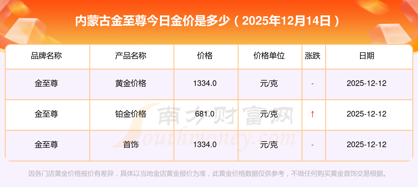 想知道今日黄金价格,目前黄金一克的价钱是多少呀?2025年12月14日内蒙古金至尊今日价格:黄金价格1336.0元/克,铂金价格681.0元/克,黄金价格1337.0元/克,铂金价格650.0元/克,黄金价格1339.0元/克,铂金价格600.0元/克,黄金价格1338.0元/克,铂金价格681.0元/克,饰品金价(内地)1336.0元/克,黄金饰品(香港)47410.0,铂金价格(香港)19550.0。