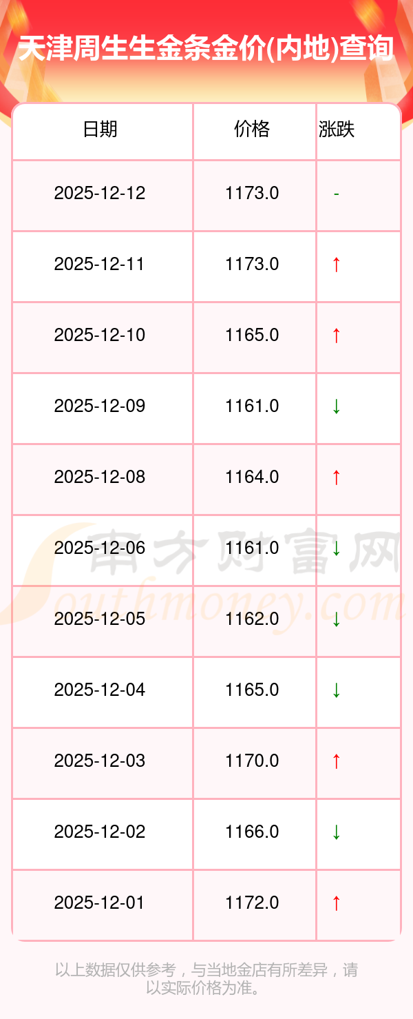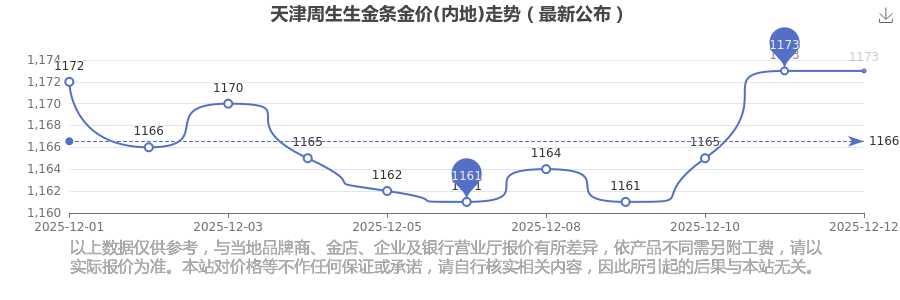 今日天津周生生金条金价(内地)的价格为1173.0元/克。