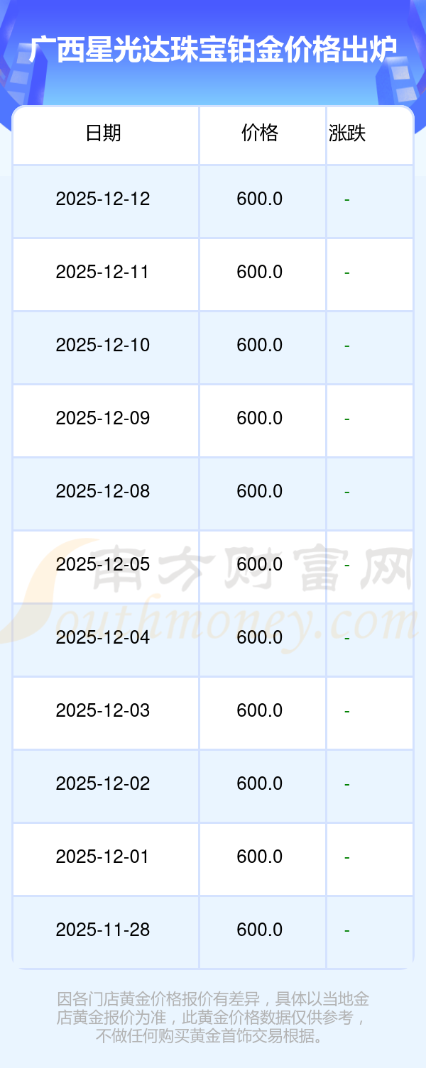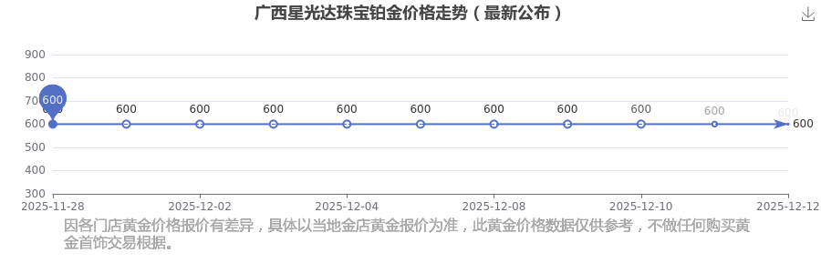 今日广西星光达珠宝铂金价格的价格为600.0元/克。