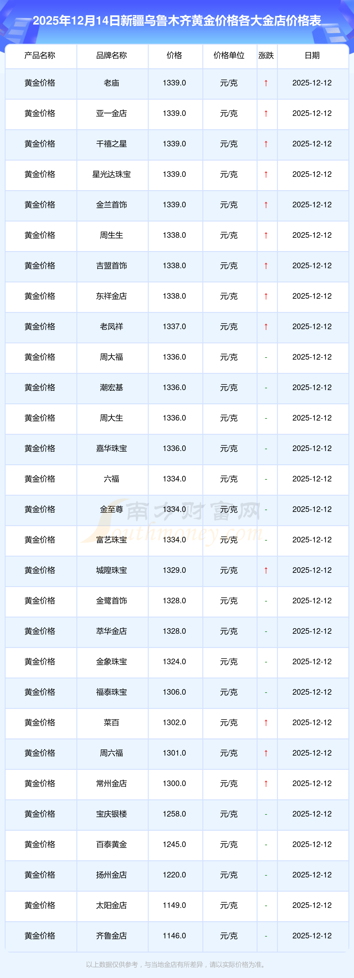 2025年12月14日新疆乌鲁木齐各大金店黄金价格最新价格:周大福1336.0元/克,周大福681.0元/克,老凤祥1337.0元/克,老凤祥650.0元/克,老庙1339.0元/克,老庙600.0元/克,周生生1338.0元/克,周生生681.0元/克,周大福1336.0元/克,周大福47410.0,周大福19550.0。
