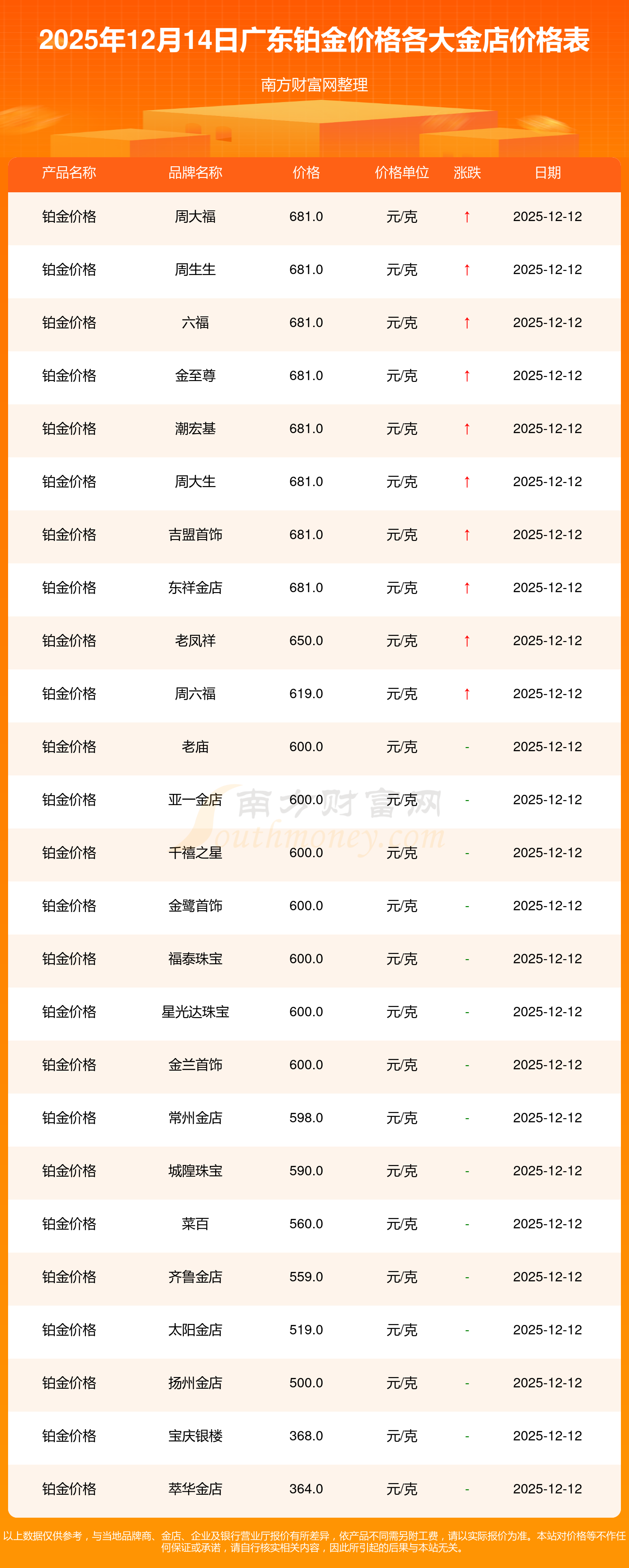 2025年12月14日广东周大福、周大福、老凤祥、老凤祥、老庙、老庙、周生生、周生生、周大福、周大福、周大福等各大金店品牌铂金价格最新价格如下:周大福黄金价格1336.0元/克,周大福铂金价格681.0元/克,老凤祥黄金价格1337.0元/克,老凤祥铂金价格650.0元/克,老庙黄金价格1339.0元/克,老庙铂金价格600.0元/克,周生生黄金价格1338.0元/克,周生生铂金价格681.0元/克,周大福饰品金价(内地)1336.0元/克,周大福黄金饰品(香港)47410.0,周大福铂金价格(香港)19550.0。