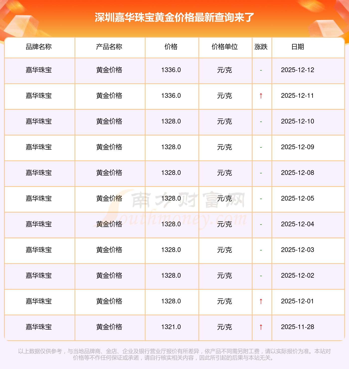 今日(2025年12月14日),深圳嘉华珠宝黄金价格的价格是1336.0元/克。