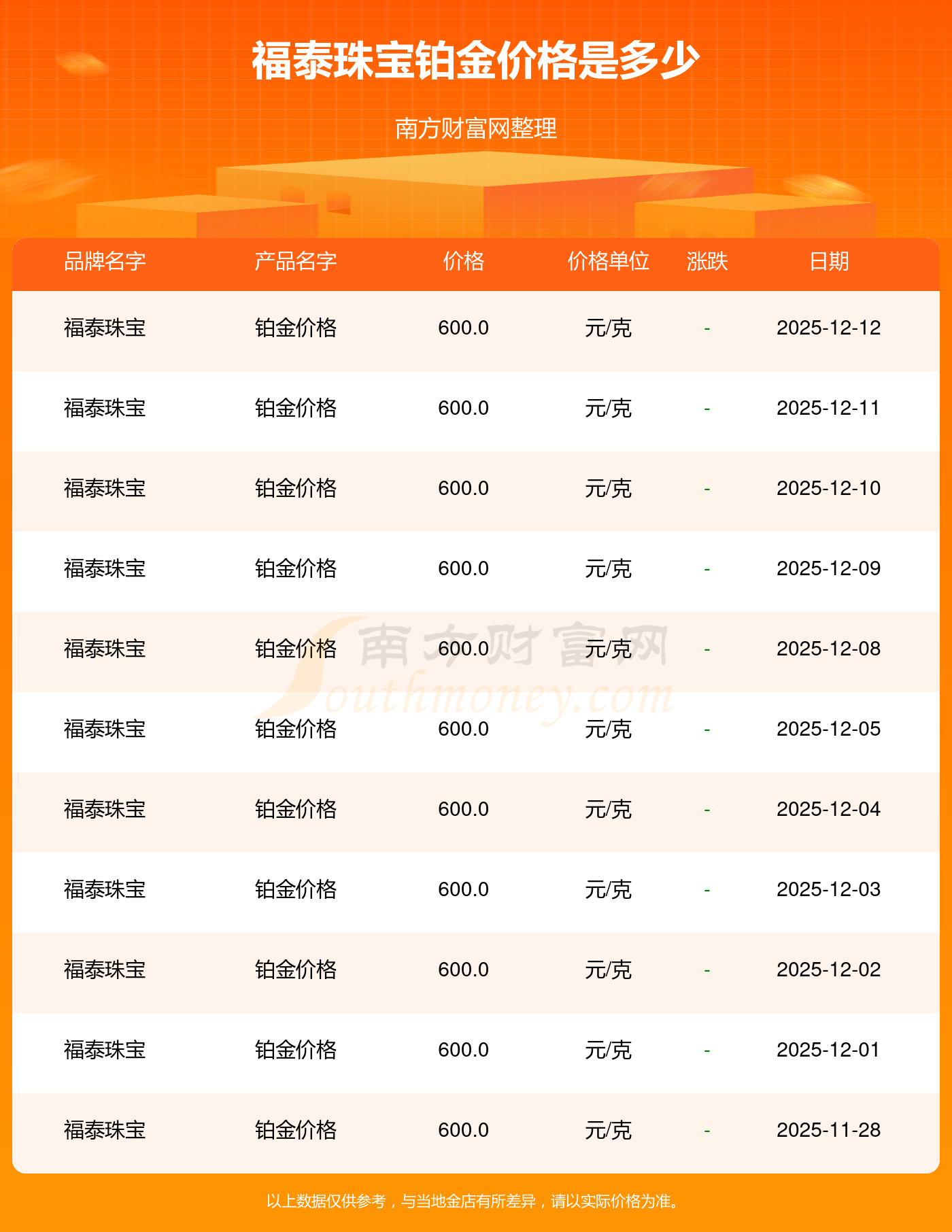 福泰珠宝今日铂金价格的最新市场行情价为600.0元/克。