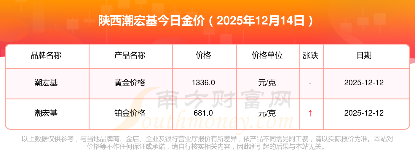 今日黄金价格查询_现在金价黄金一克多少钱,黄金价格是多少钱一克?2025年12月14日陕西潮宏基今日价格:黄金价格1336.0元/克,铂金价格681.0元/克,黄金价格1337.0元/克,铂金价格650.0元/克,黄金价格1339.0元/克,铂金价格600.0元/克,黄金价格1338.0元/克,铂金价格681.0元/克,饰品金价(内地)1336.0元/克,黄金饰品(香港)47410.0,铂金价格(香港)19550.0。