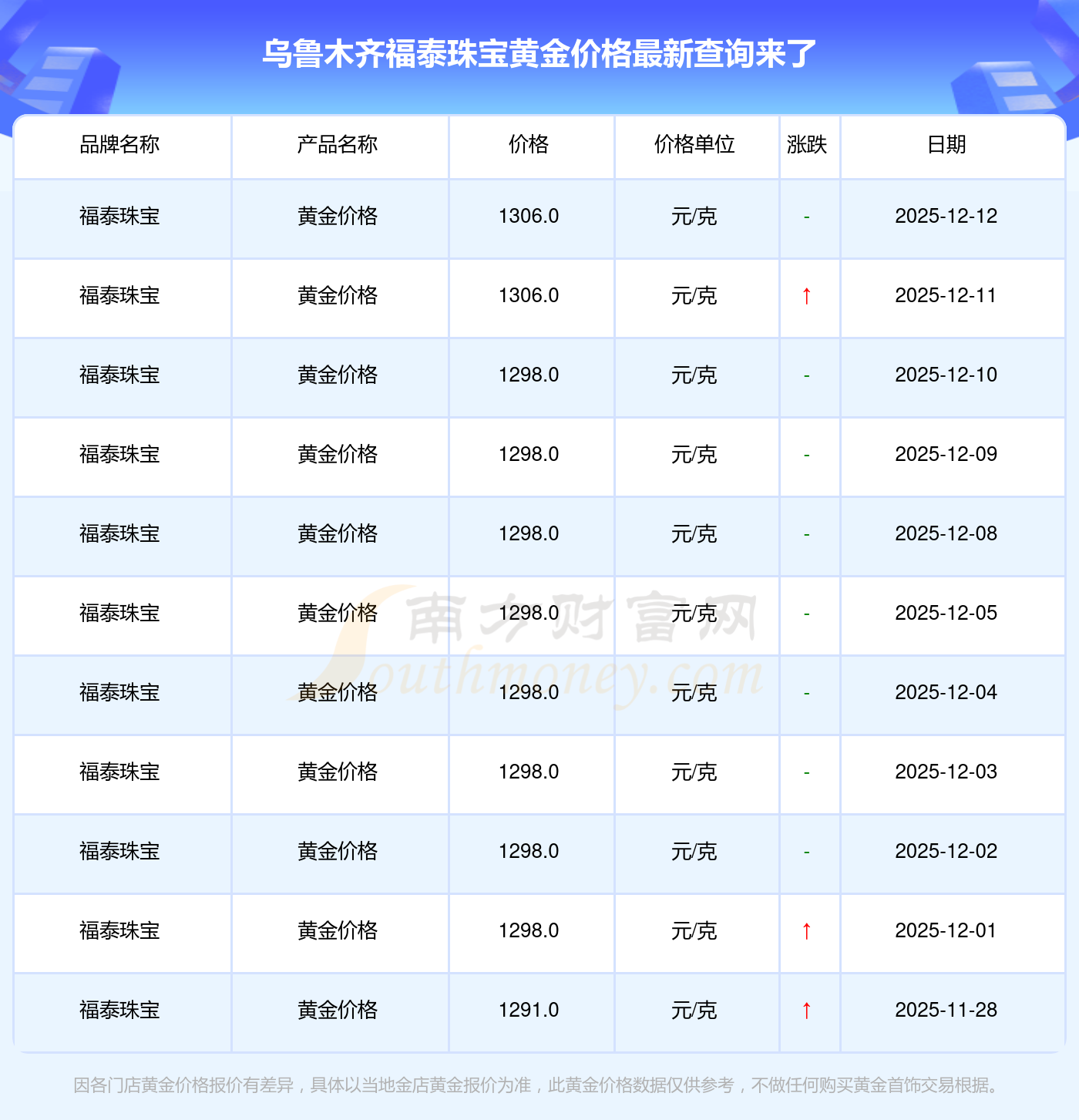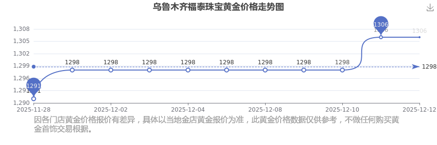 今日乌鲁木齐福泰珠宝黄金价格是1306.0元/克。