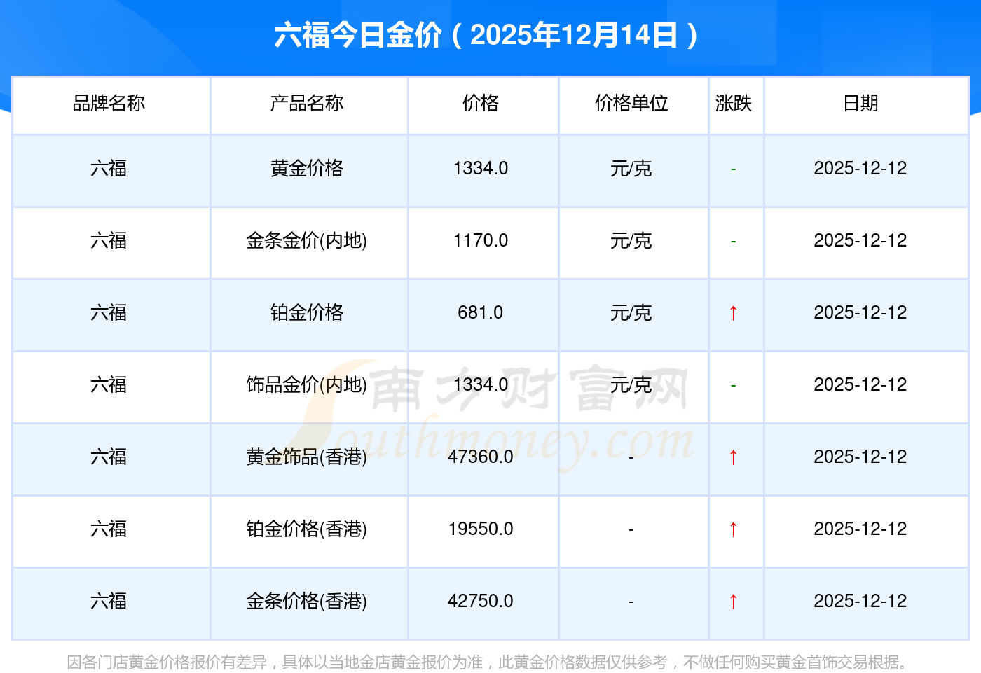 2025年12月14日,周大福、周大福、老凤祥、老凤祥、老庙、老庙、周生生、周生生、周大福、周大福、周大福等各大金店品牌金条金价(内地)今日价格如下:周大福1336.0元/克、周大福681.0元/克、老凤祥1337.0元/克、老凤祥650.0元/克、老庙1339.0元/克、老庙600.0元/克、周生生1338.0元/克、周生生681.0元/克、周大福1336.0元/克、周大福47410.0、周大福19550.0。