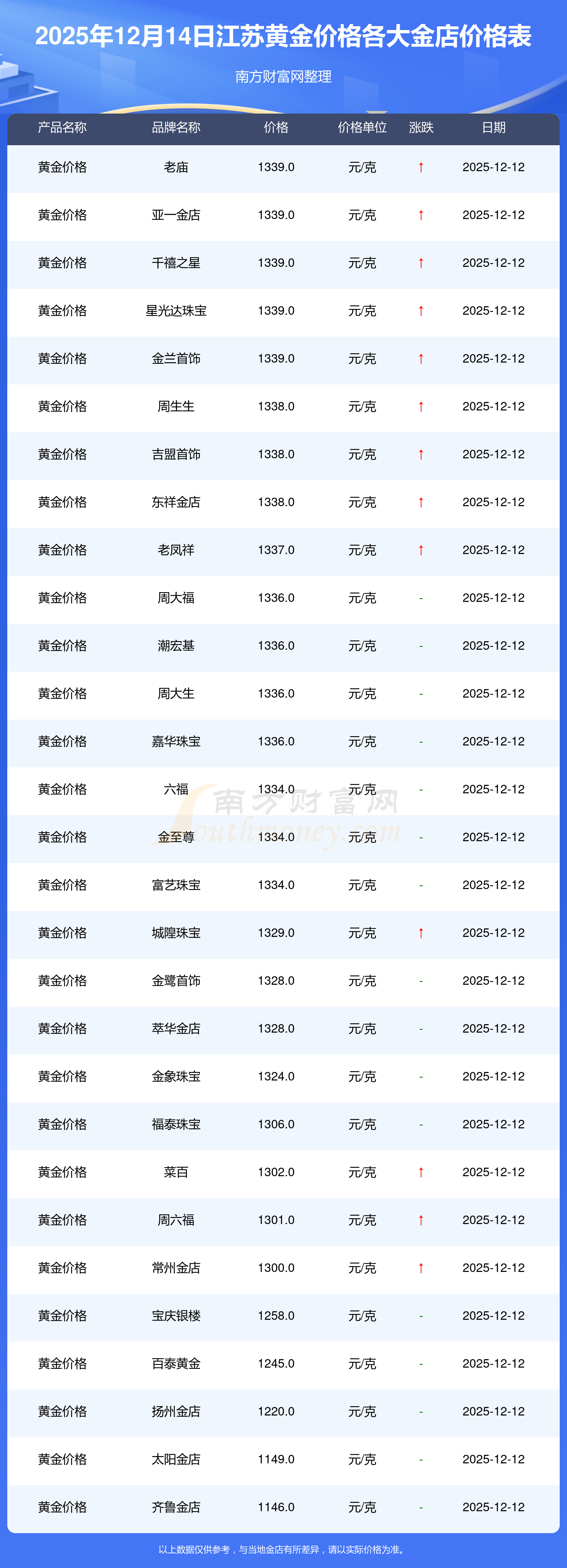 今天是2025年12月14日,江苏周大福、周大福、老凤祥、老凤祥、老庙、老庙、周生生、周生生、周大福、周大福、周大福等各大金店品牌黄金价格最新价格行情是这样的:周大福1336.0元/克、周大福681.0元/克、老凤祥1337.0元/克、老凤祥650.0元/克、老庙1339.0元/克、老庙600.0元/克、周生生1338.0元/克、周生生681.0元/克、周大福1336.0元/克、周大福47410.0、周大福19550.0。