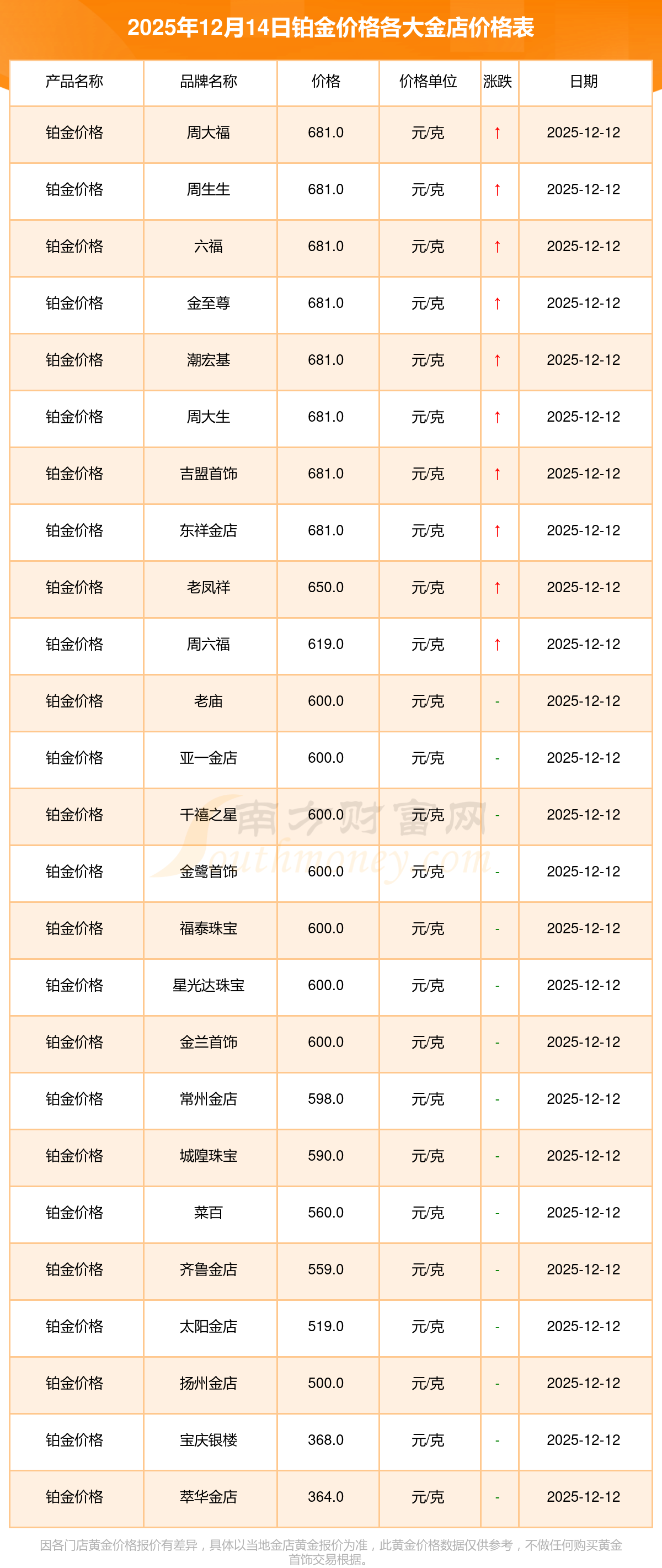 2025年12月14日周大福、周大福、老凤祥、老凤祥、老庙、老庙、周生生、周生生、周大福、周大福、周大福等各大金店品牌铂金价格最新价格如下:周大福黄金价格1336.0元/克,周大福铂金价格681.0元/克,老凤祥黄金价格1337.0元/克,老凤祥铂金价格650.0元/克,老庙黄金价格1339.0元/克,老庙铂金价格600.0元/克,周生生黄金价格1338.0元/克,周生生铂金价格681.0元/克,周大福饰品金价(内地)1336.0元/克,周大福黄金饰品(香港)47410.0,周大福铂金价格(香港)19550.0。