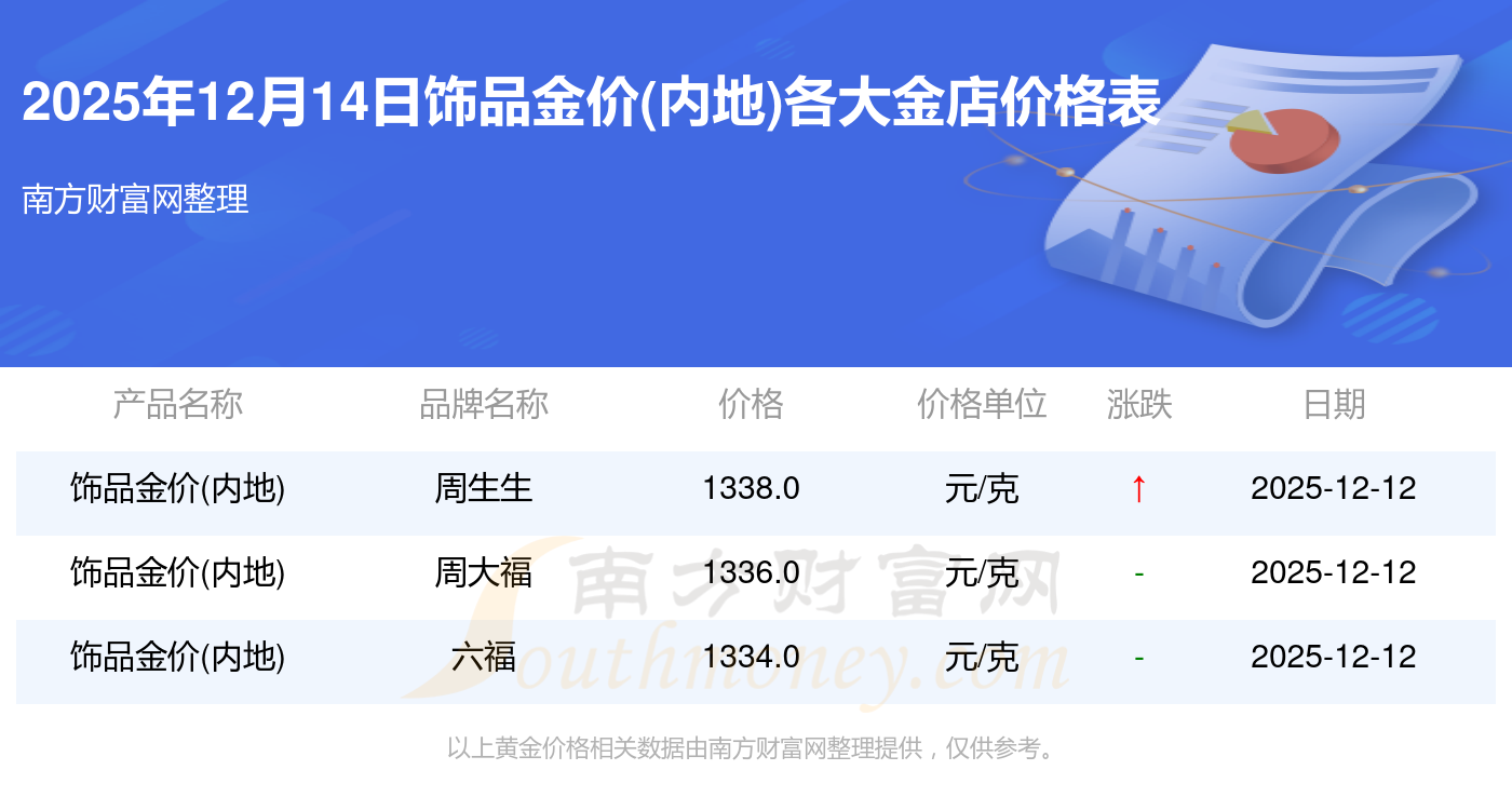 2025年12月14日各大金店饰品金价(内地)最新价格:周大福1336.0元/克,周大福681.0元/克,老凤祥1337.0元/克,老凤祥650.0元/克,老庙1339.0元/克,老庙600.0元/克,周生生1338.0元/克,周生生681.0元/克,周大福1336.0元/克,周大福47410.0,周大福19550.0。