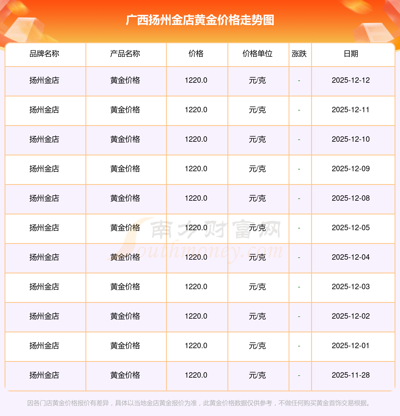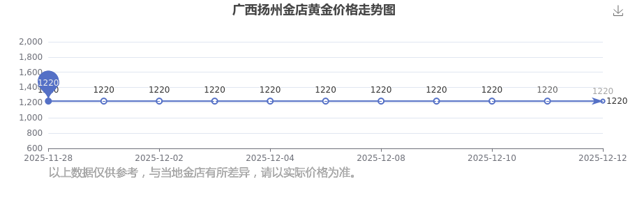 今日(2025年12月14日)广西扬州金店黄金价格最新价格为1220.0元/克。