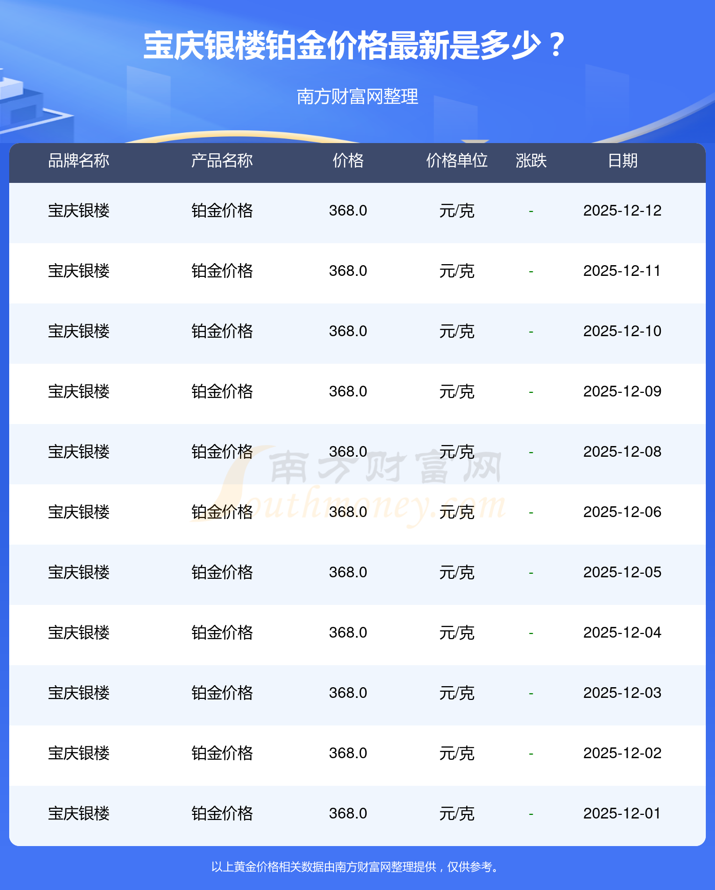 今日(2025年12月14日)宝庆银楼铂金价格的价格为368.0元/克。