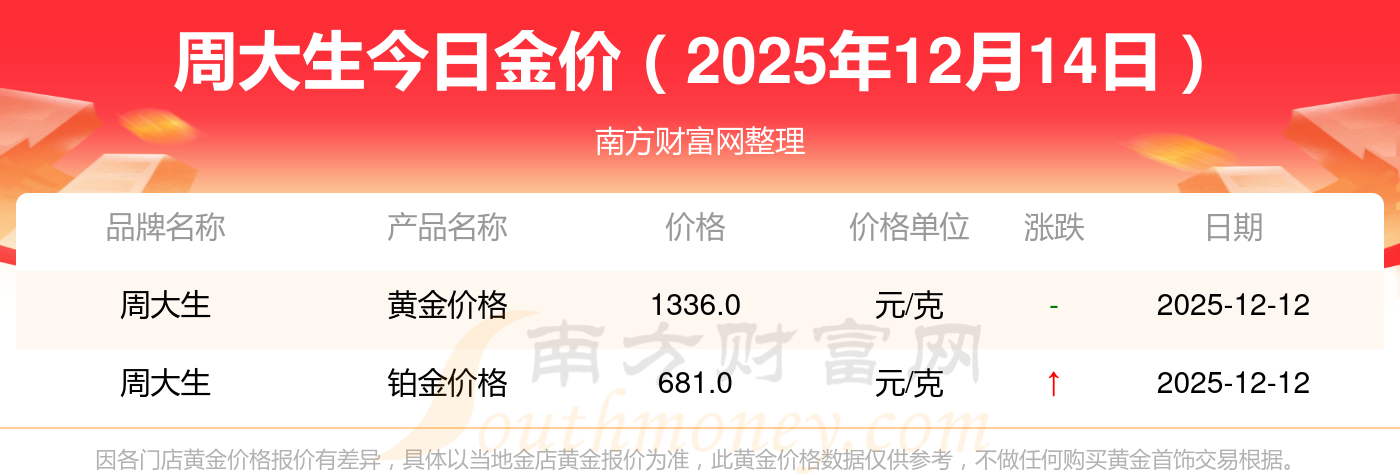 2025年12月14日各大金店黄金价格最新价格:周大福1336.0元/克,周大福681.0元/克,老凤祥1337.0元/克,老凤祥650.0元/克,老庙1339.0元/克,老庙600.0元/克,周生生1338.0元/克,周生生681.0元/克,周大福1336.0元/克,周大福47410.0,周大福19550.0。