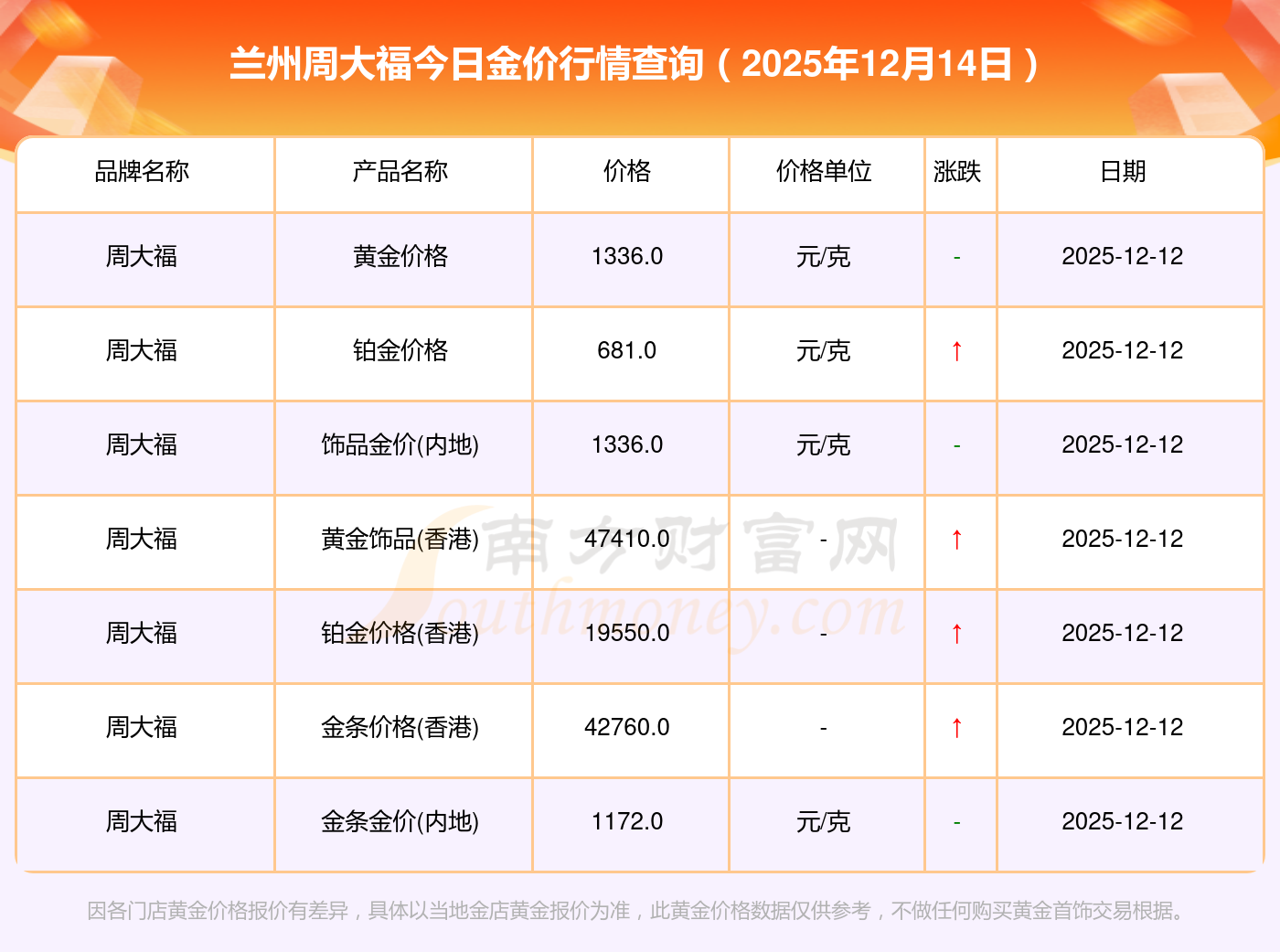 2025年12月14日兰州周大福一克黄金的售价是多少:黄金价格1336.0元/克,铂金价格681.0元/克,黄金价格1337.0元/克,铂金价格650.0元/克,黄金价格1339.0元/克,铂金价格600.0元/克,黄金价格1338.0元/克,铂金价格681.0元/克,饰品金价(内地)1336.0元/克,黄金饰品(香港)47410.0,铂金价格(香港)19550.0。