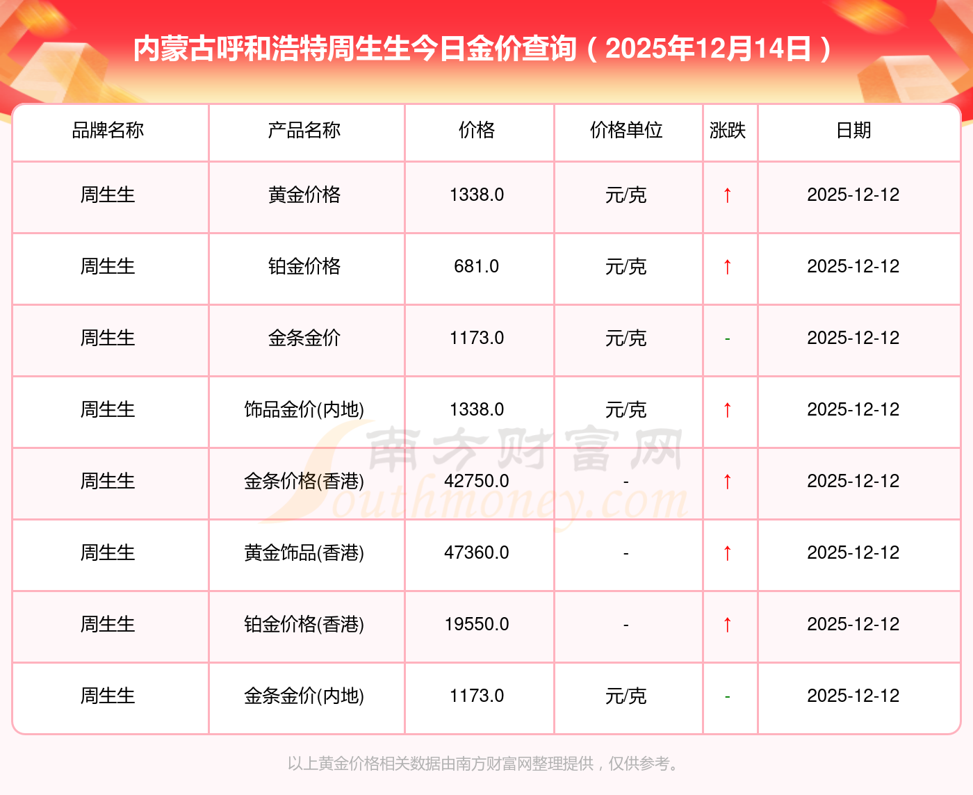 今天黄金价格行情如何?现在一克黄金的售价是多少?2025年12月14日内蒙古呼和浩特周生生黄金的单价,一克为多少?黄金价格1336.0元/克,铂金价格681.0元/克,黄金价格1337.0元/克,铂金价格650.0元/克,黄金价格1339.0元/克,铂金价格600.0元/克,黄金价格1338.0元/克,铂金价格681.0元/克,饰品金价(内地)1336.0元/克,黄金饰品(香港)47410.0,铂金价格(香港)19550.0。