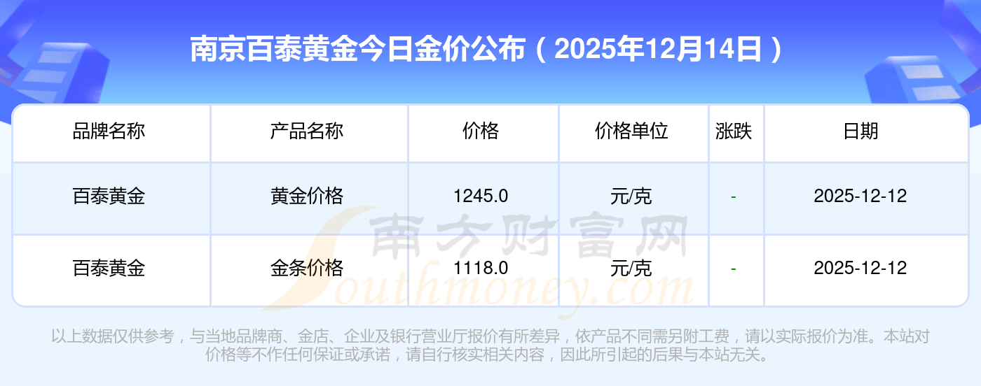 今日黄金价格查询_现在金价黄金一克多少钱,黄金价格是多少钱一克? 2025年12月14日南京百泰黄金一克黄金的售价是多少:黄金价格1336.0元/克,铂金价格681.0元/克,黄金价格1337.0元/克,铂金价格650.0元/克,黄金价格1339.0元/克,铂金价格600.0元/克,黄金价格1338.0元/克,铂金价格681.0元/克,饰品金价(内地)1336.0元/克,黄金饰品(香港)47410.0,铂金价格(香港)19550.0。