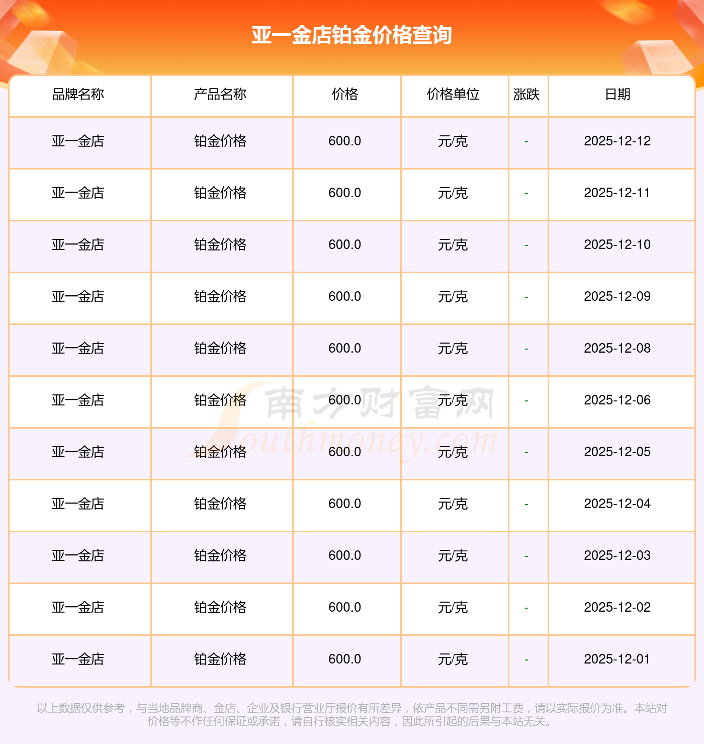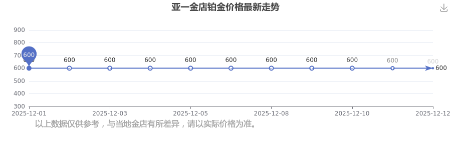 2025年12月14日亚一金店铂金价格最新为600.0元/克。
