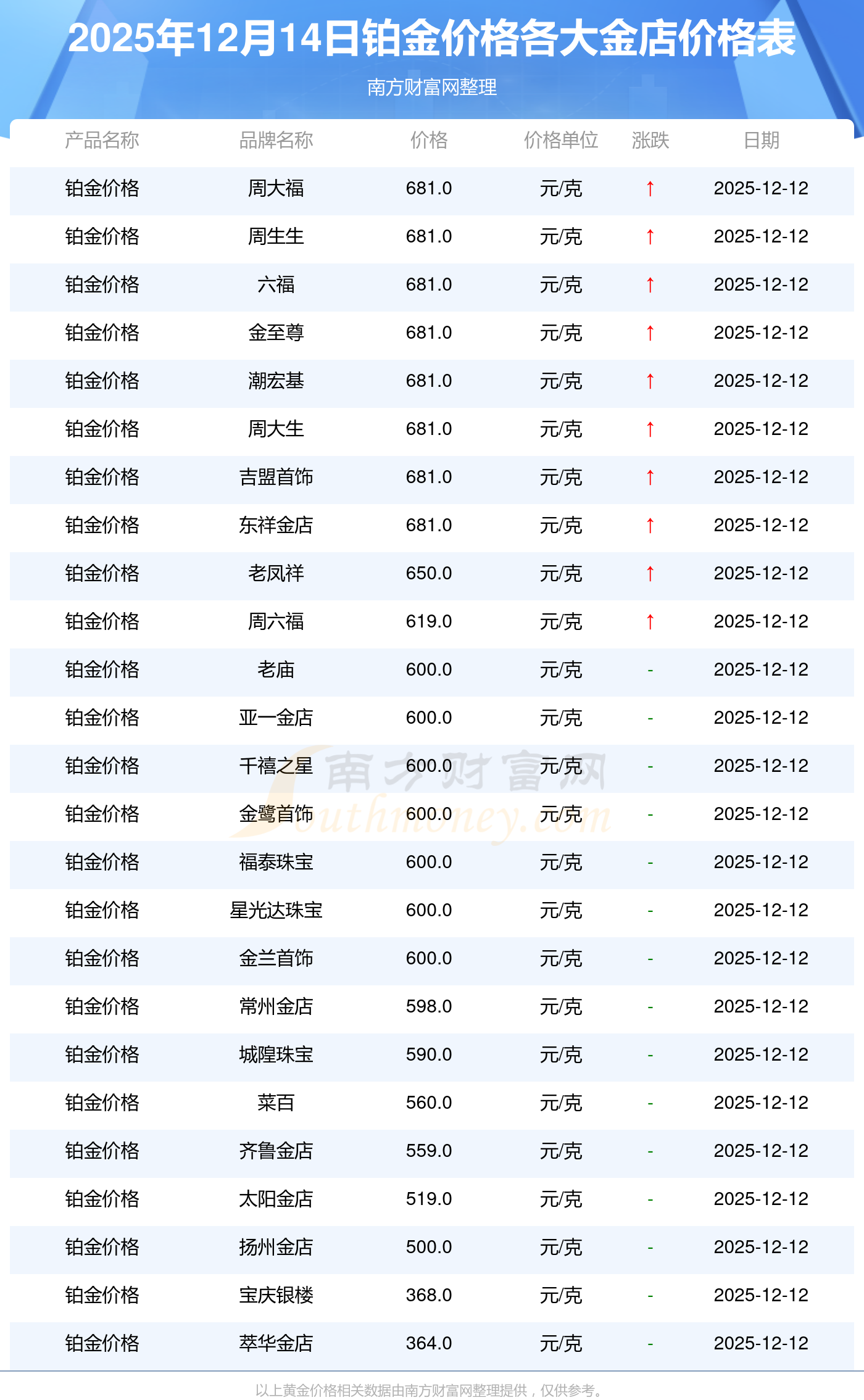 2025年12月14日,周大福、周大福、老凤祥、老凤祥、老庙、老庙、周生生、周生生、周大福、周大福、周大福等各大金店品牌铂金价格今日价格如下:周大福1336.0元/克、周大福681.0元/克、老凤祥1337.0元/克、老凤祥650.0元/克、老庙1339.0元/克、老庙600.0元/克、周生生1338.0元/克、周生生681.0元/克、周大福1336.0元/克、周大福47410.0、周大福19550.0。