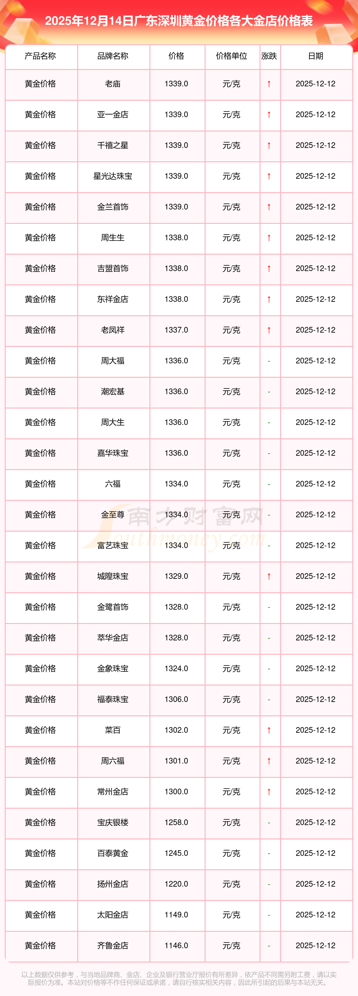 今天是2025年12月14日,广东深圳周大福、周大福、老凤祥、老凤祥、老庙、老庙、周生生、周生生、周大福、周大福、周大福等各大金店品牌黄金价格最新价格行情是这样的:周大福1336.0元/克、周大福681.0元/克、老凤祥1337.0元/克、老凤祥650.0元/克、老庙1339.0元/克、老庙600.0元/克、周生生1338.0元/克、周生生681.0元/克、周大福1336.0元/克、周大福47410.0、周大福19550.0。