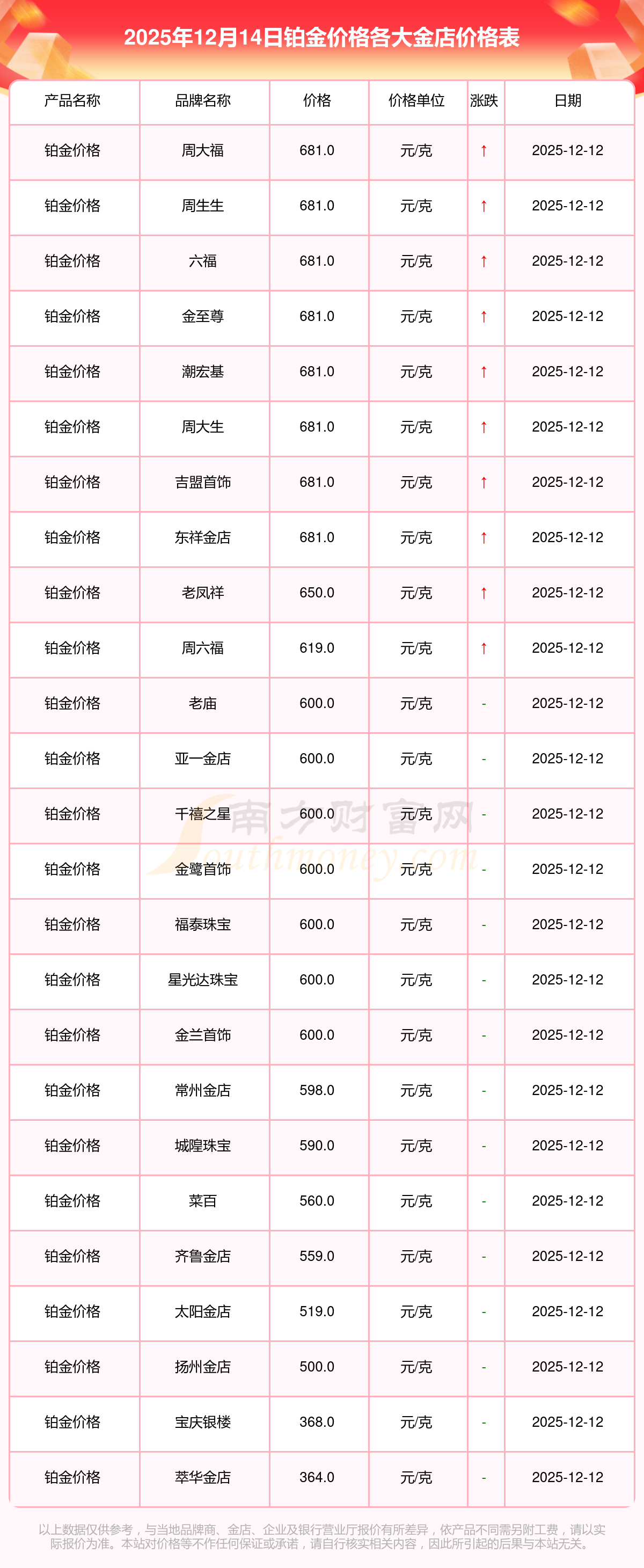 2025年12月14日,周大福、周大福、老凤祥、老凤祥、老庙、老庙、周生生、周生生、周大福、周大福、周大福等各大金店品牌铂金价格今日价格如下:周大福1336.0元/克、周大福681.0元/克、老凤祥1337.0元/克、老凤祥650.0元/克、老庙1339.0元/克、老庙600.0元/克、周生生1338.0元/克、周生生681.0元/克、周大福1336.0元/克、周大福47410.0、周大福19550.0。