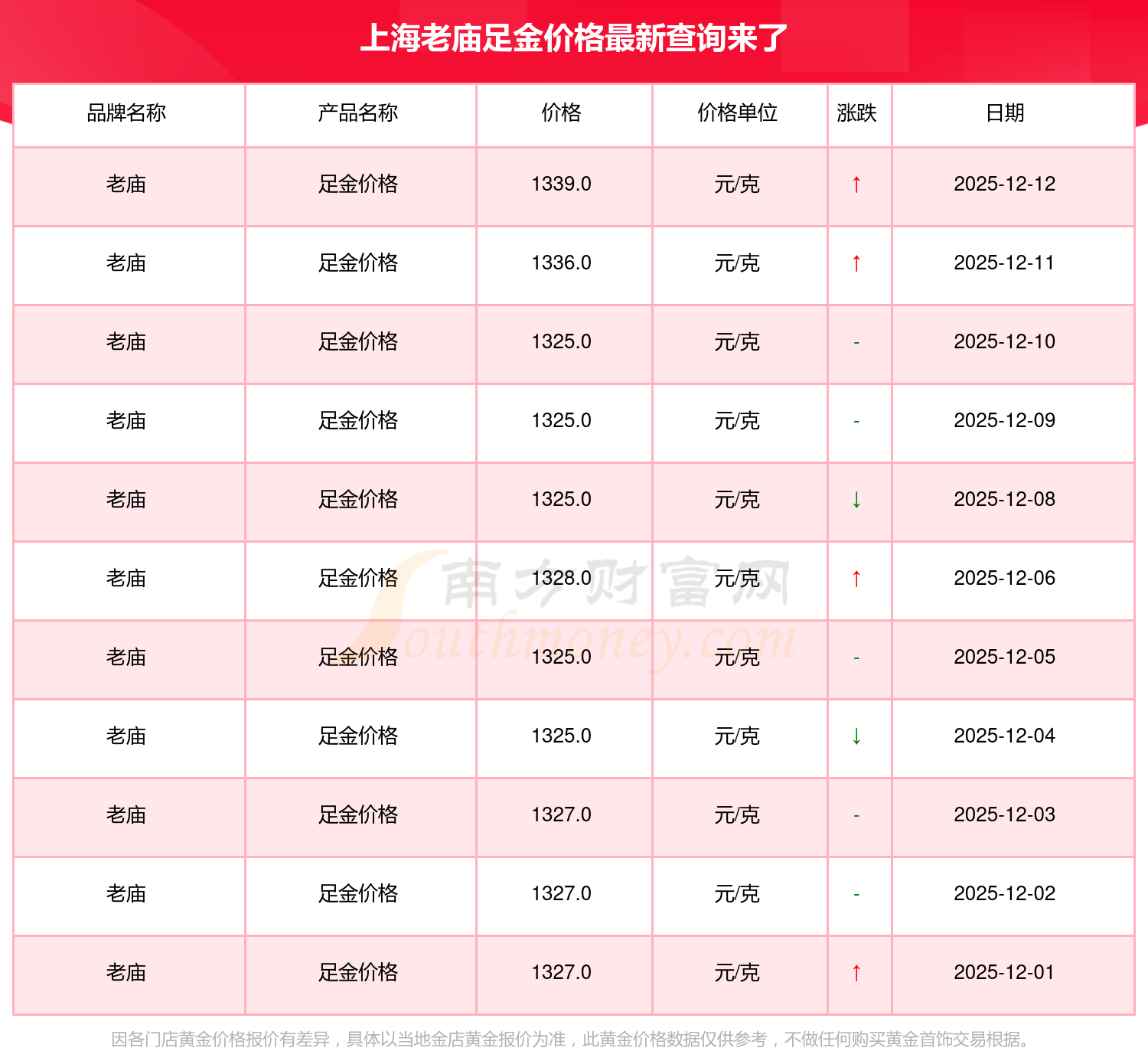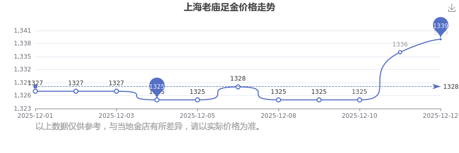 于 2025年12月14日,上海老庙足金价格的克价为1339.0元/克。
