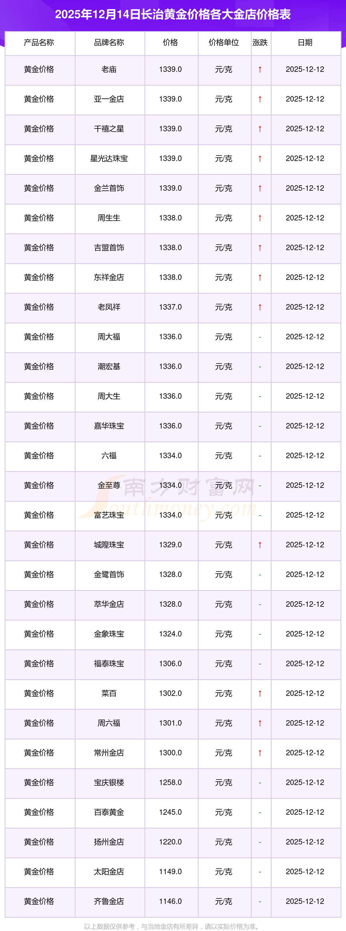 2025年12月14日长治各大金店黄金价格最新价格查询来了:周大福1336.0元/克,周大福681.0元/克,老凤祥1337.0元/克,老凤祥650.0元/克,老庙1339.0元/克,老庙600.0元/克,周生生1338.0元/克,周生生681.0元/克,周大福1336.0元/克,周大福47410.0,周大福19550.0。