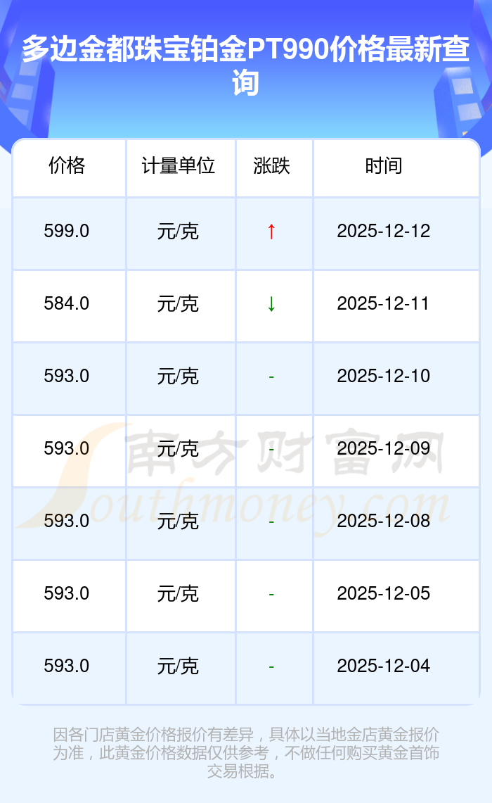 目前多边金都珠宝 铂金PT990的价格,今日最新为599.0元/克。