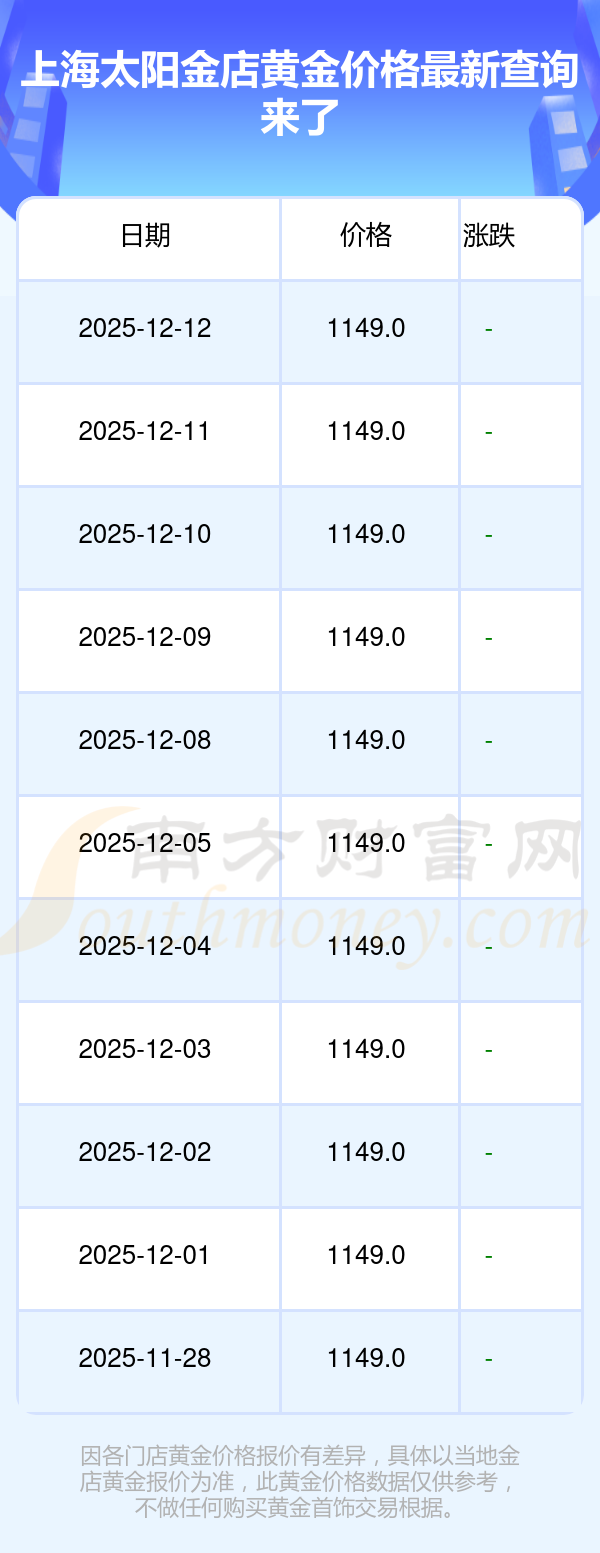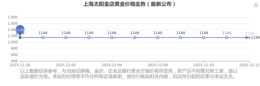 (2025年12月14日)上海太阳金店黄金价格现在为1149.0元/克。
