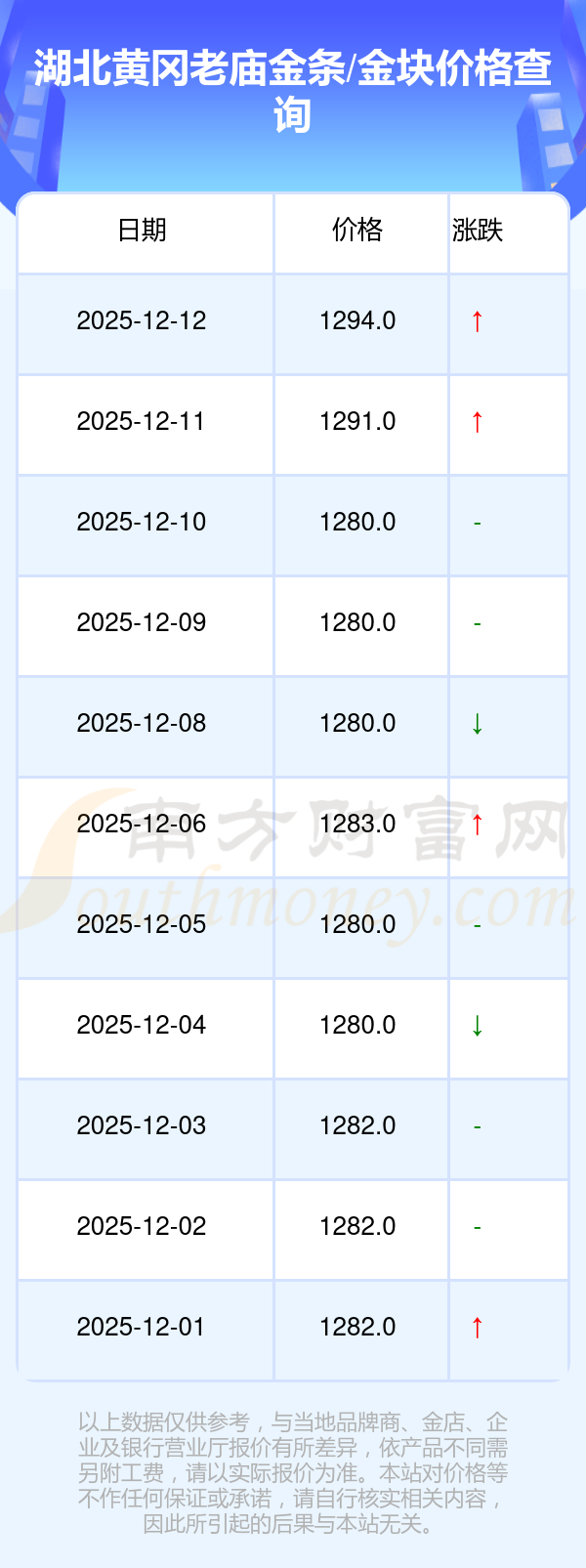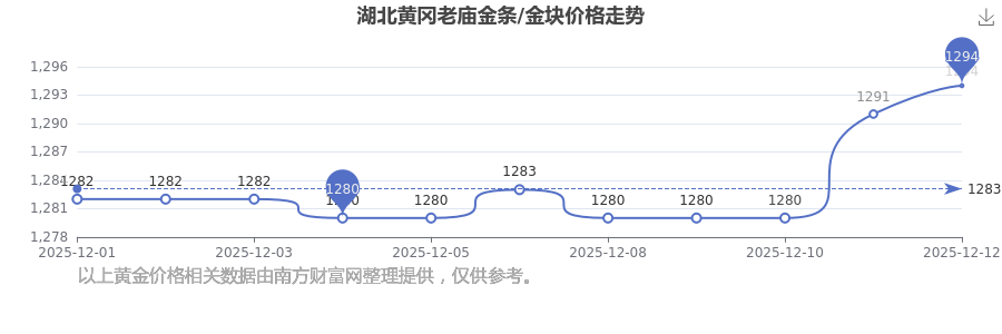 2025年12月14日,湖北黄冈老庙金条/金块价格每克的售卖价位为1294.0元/克。