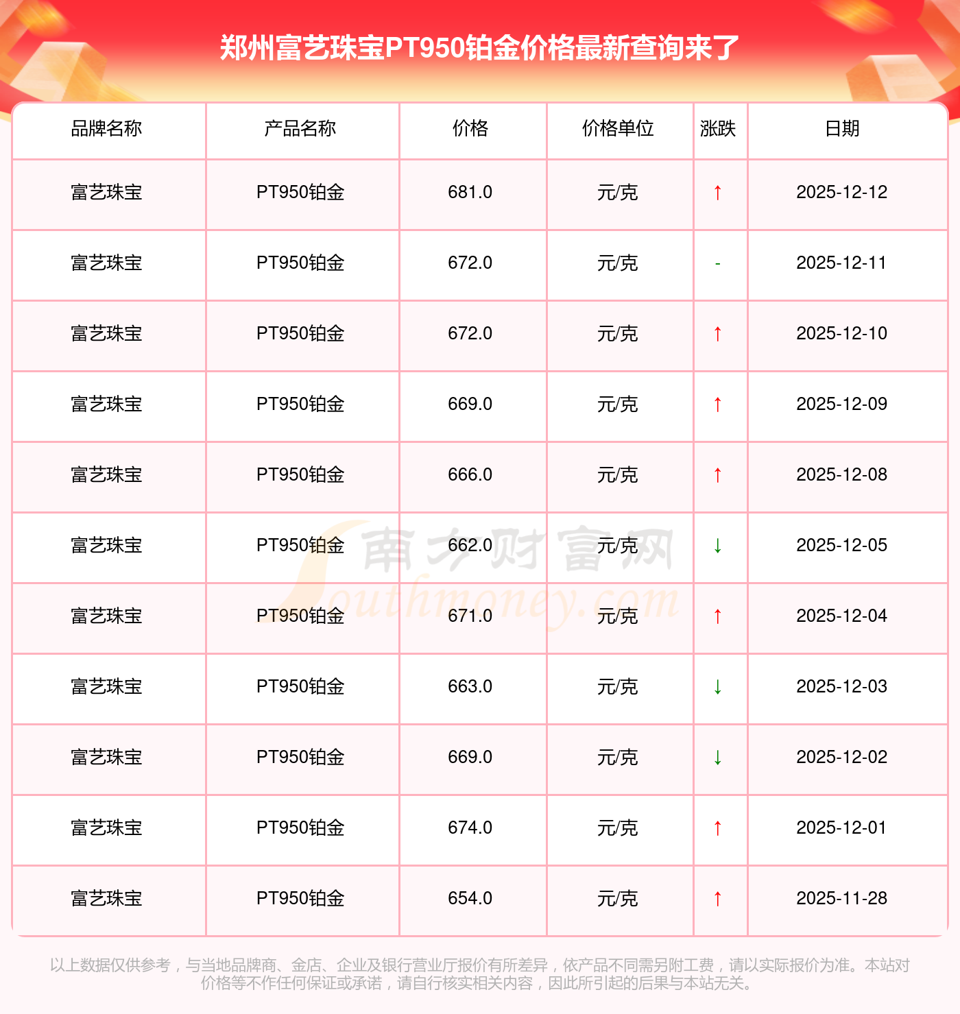 今天是2025年12月14日,周大福、周大福、老凤祥、老凤祥、老庙、老庙、周生生、周生生、周大福、周大福、周大福等各大金店品牌PT950铂金最新价格如下:周大福1336.0元/克、周大福681.0元/克、老凤祥1337.0元/克、老凤祥650.0元/克、老庙1339.0元/克、老庙600.0元/克、周生生1338.0元/克、周生生681.0元/克、周大福1336.0元/克、周大福47410.0、周大福19550.0。