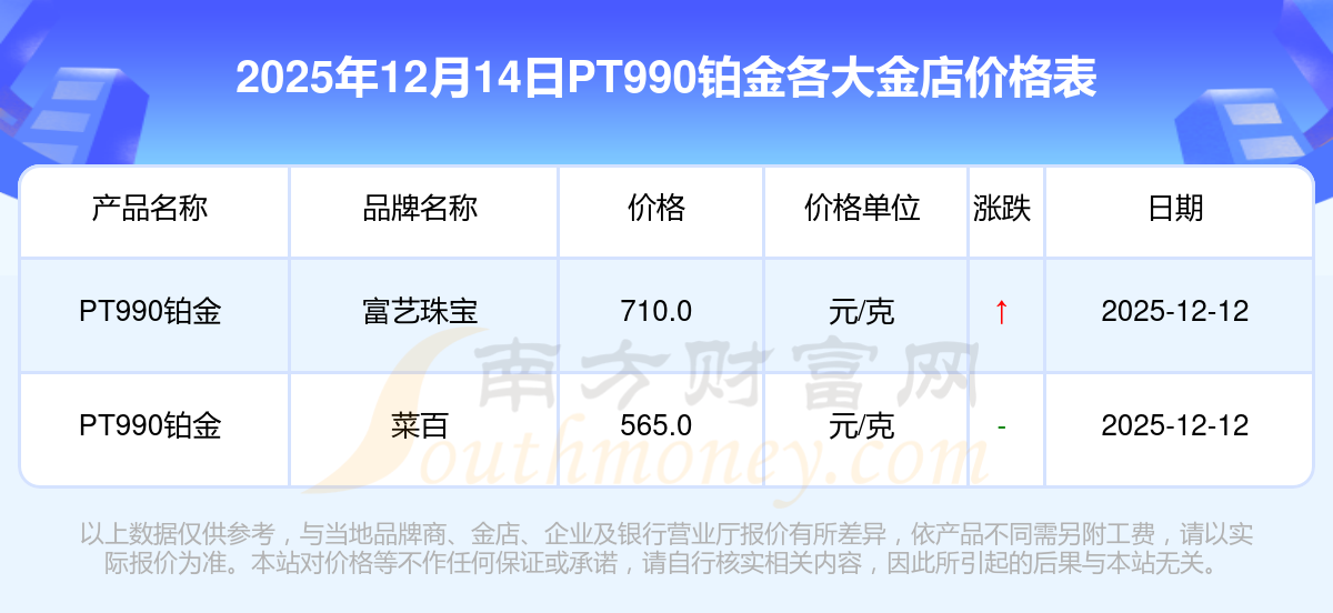 2025年12月14日周大福、周大福、老凤祥、老凤祥、老庙、老庙、周生生、周生生、周大福、周大福、周大福等各大金店品牌PT990铂金最新价格如下:周大福黄金价格1336.0元/克,周大福铂金价格681.0元/克,老凤祥黄金价格1337.0元/克,老凤祥铂金价格650.0元/克,老庙黄金价格1339.0元/克,老庙铂金价格600.0元/克,周生生黄金价格1338.0元/克,周生生铂金价格681.0元/克,周大福饰品金价(内地)1336.0元/克,周大福黄金饰品(香港)47410.0,周大福铂金价格(香港)19550.0。