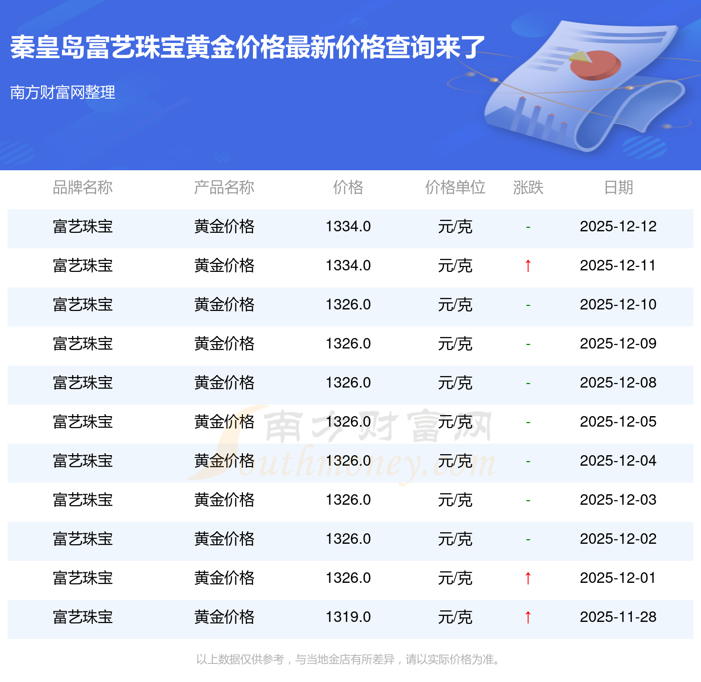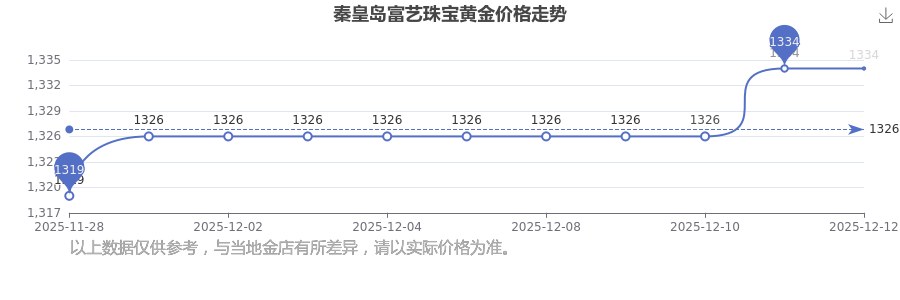 (2025年12月14日)秦皇岛富艺珠宝黄金价格现在为1334.0元/克。