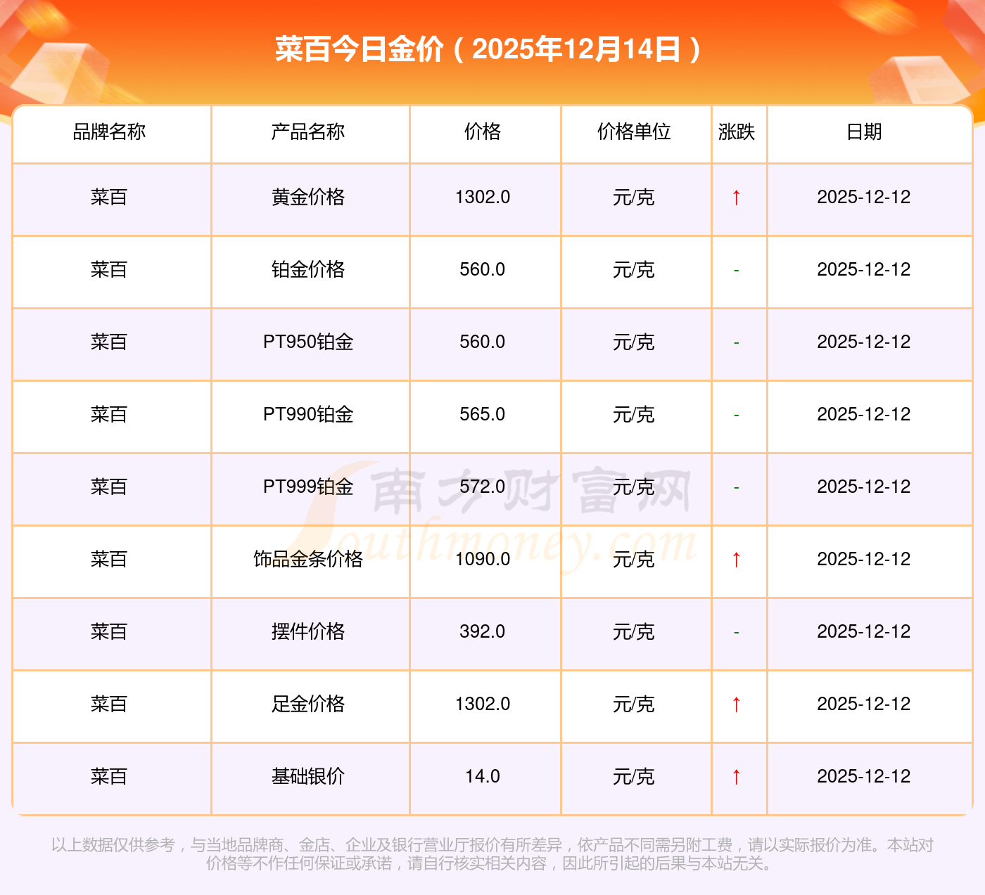 2025年12月14日菜百今日价格:黄金价格1336.0元/克,铂金价格681.0元/克,黄金价格1337.0元/克,铂金价格650.0元/克,黄金价格1339.0元/克,铂金价格600.0元/克,黄金价格1338.0元/克,铂金价格681.0元/克,饰品金价(内地)1336.0元/克,黄金饰品(香港)47410.0,铂金价格(香港)19550.0。