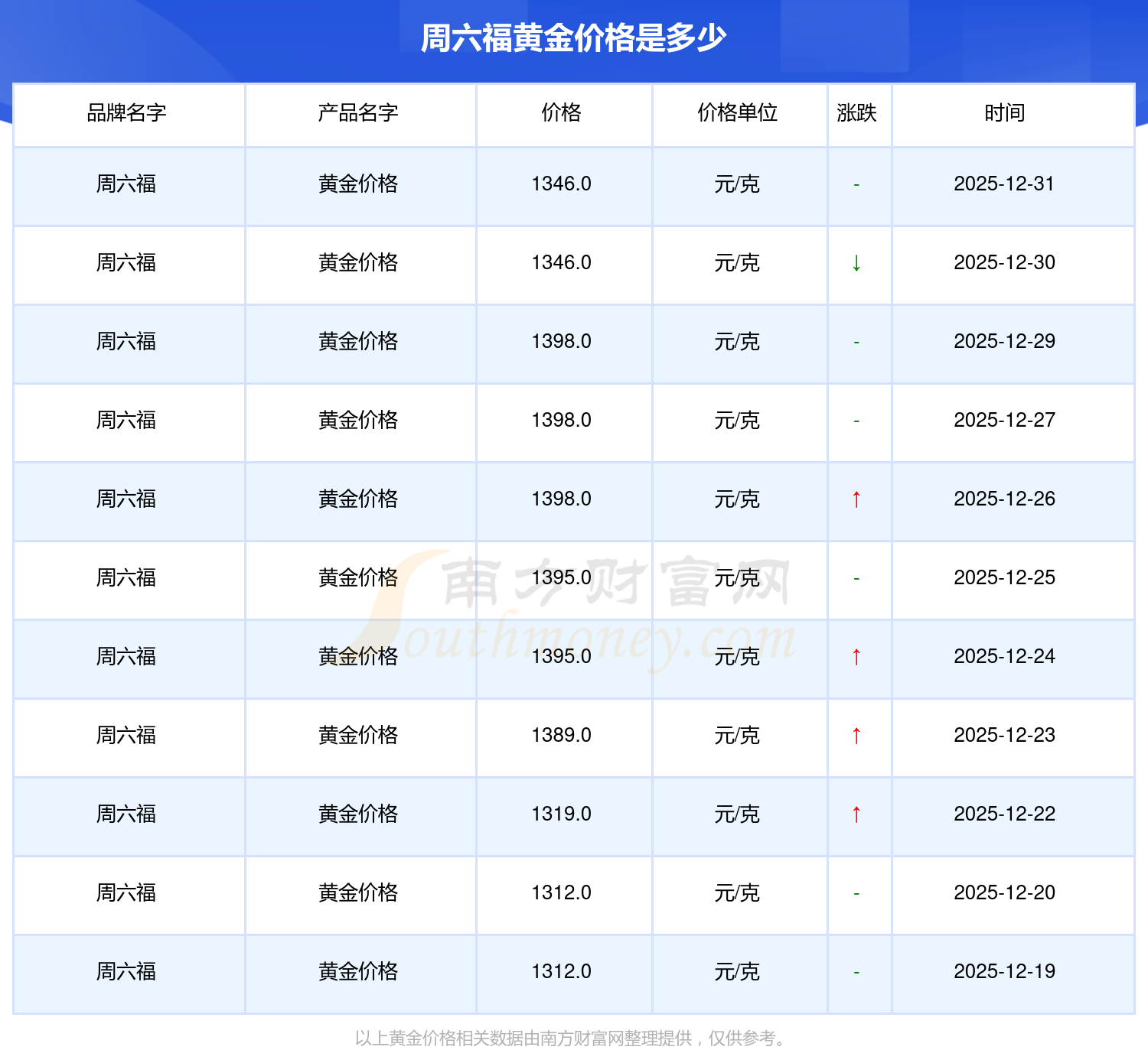 2025年12月31日周六福黄金价格最新是1346.0元/克。