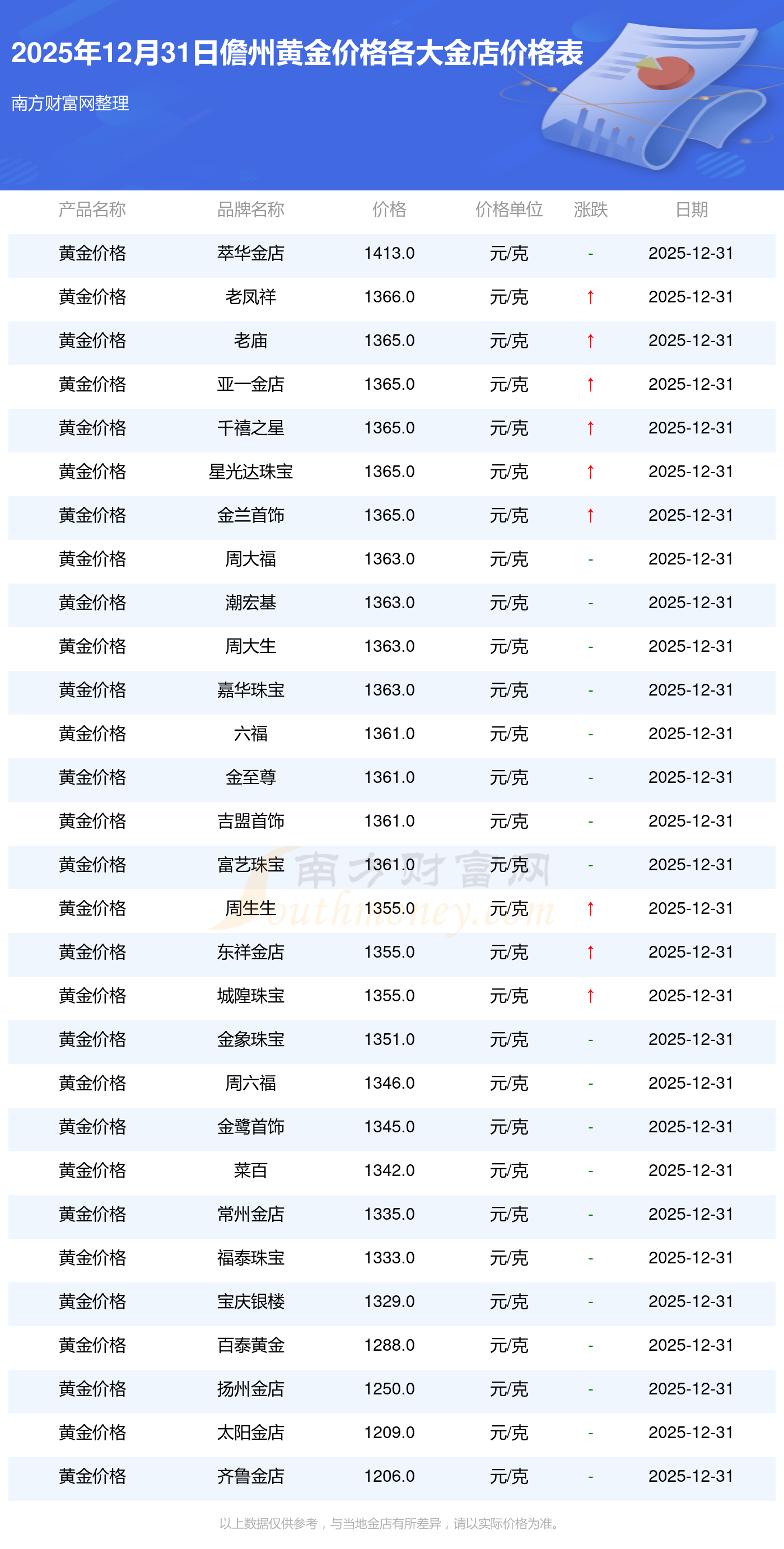 2025年12月31日儋州周大福、老凤祥、老庙、周生生、周大福、周大福、周大福、周大福、周大福、周大福、老凤祥等各大金店品牌黄金价格最新价格行情来了,如下:周大福黄金价格1363.0元/克,老凤祥黄金价格1366.0元/克,老庙黄金价格1365.0元/克,周生生黄金价格1355.0元/克,周大福铂金价格849.0元/克,周大福饰品金价(内地)1363.0元/克,周大福黄金饰品(香港)48780.0,周大福铂金价格(香港)25090.0,周大福金条价格(香港)43680.0,周大福金条金价(内地)1195.0元/克,老凤祥铂金价格820.0元/克。