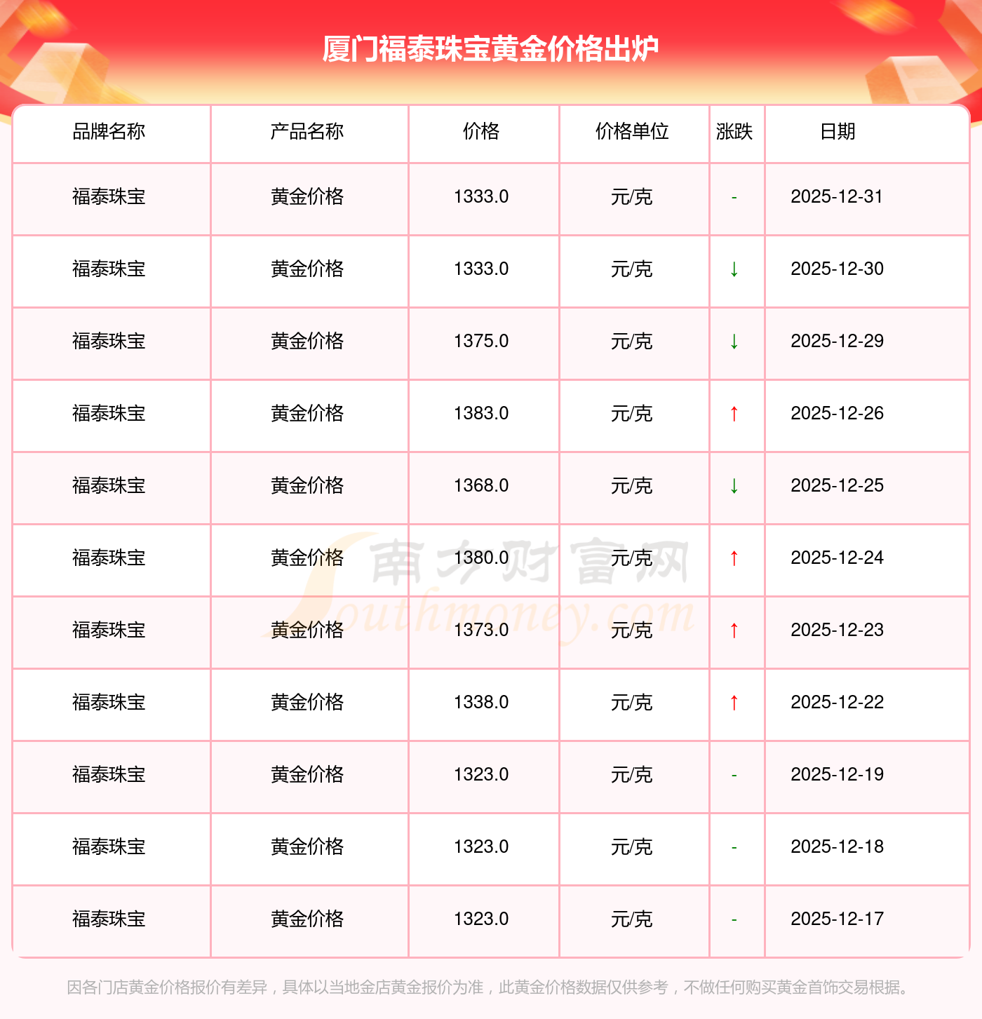 今日厦门福泰珠宝黄金价格为1333.0元/克。