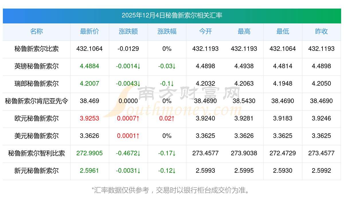 根据2025年12月4日汇率,秘鲁新索尔兑换智利比索汇率最新价272.990500,今开价273.4577,昨收价273.4577,最高价273.9038,最低价272.4729。