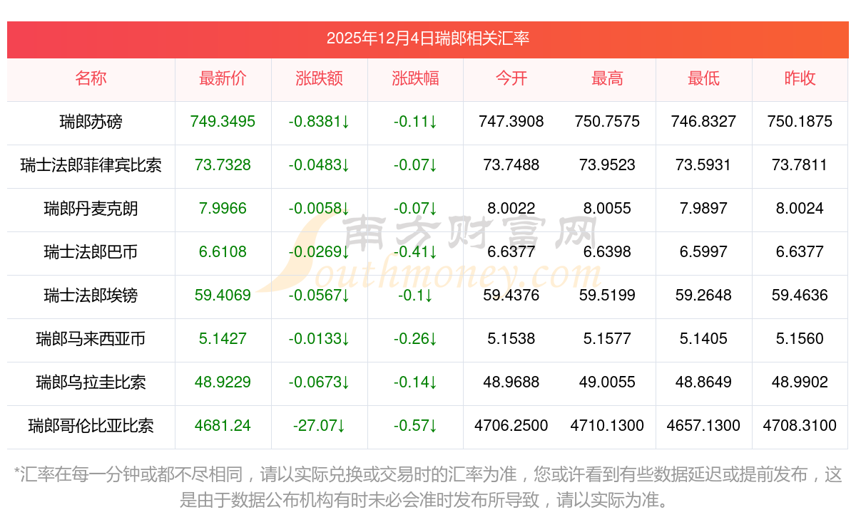 根据2025年12月4日汇率计算,CHF兑换CAD汇率最新价1.744000,今开价1.7438,昨收价1.7446,最高价1.7476,最低价1.7427。