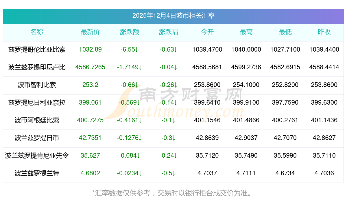 根据2025年12月4日汇率计算,PLN兑换CZK汇率最新价5.710000:今开价5.7041,昨收价5.7039,最高价5.7298,最低价5.7004。