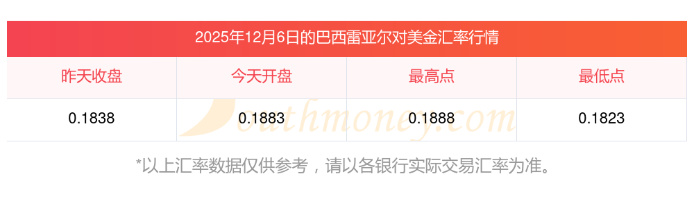 2025年12月6日巴西雷亚尔兑换美金汇率是:0.18384