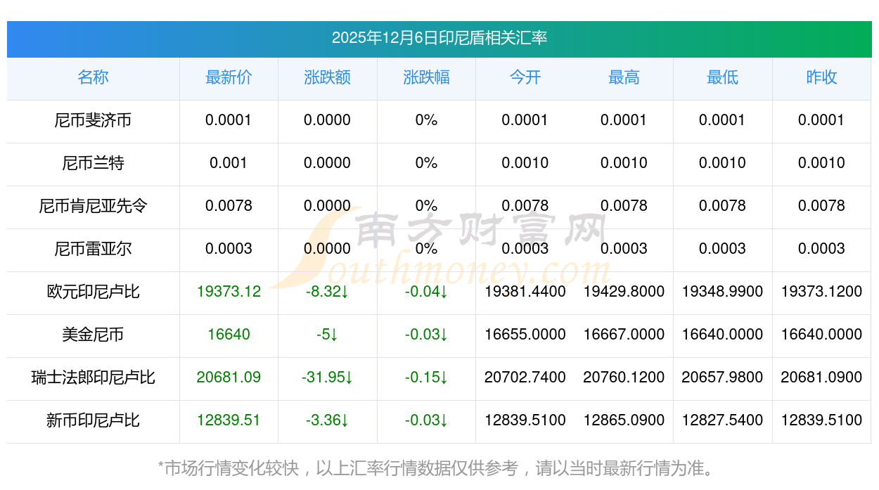 根据2025年12月6日汇率,印尼盾兑换加元汇率最新0.000083,今开0.0001,昨收0.0001,最高0.0001,最低0.0001。