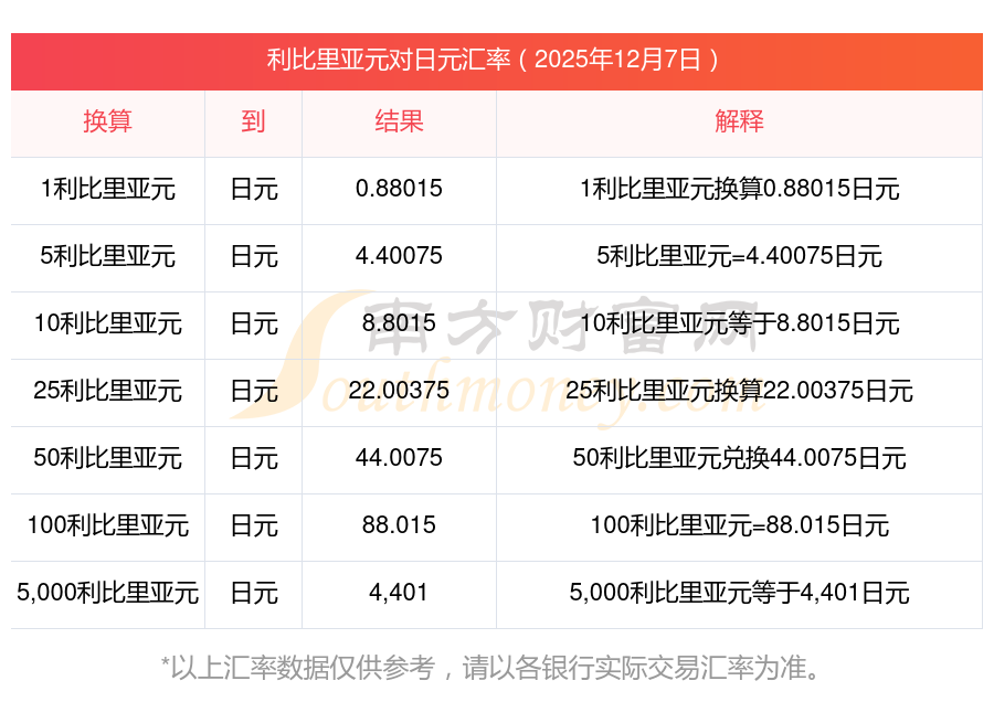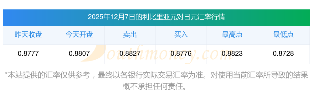 今日利比里亚元对日元汇率多少?利比里亚元汇率行情?2025年12月7日