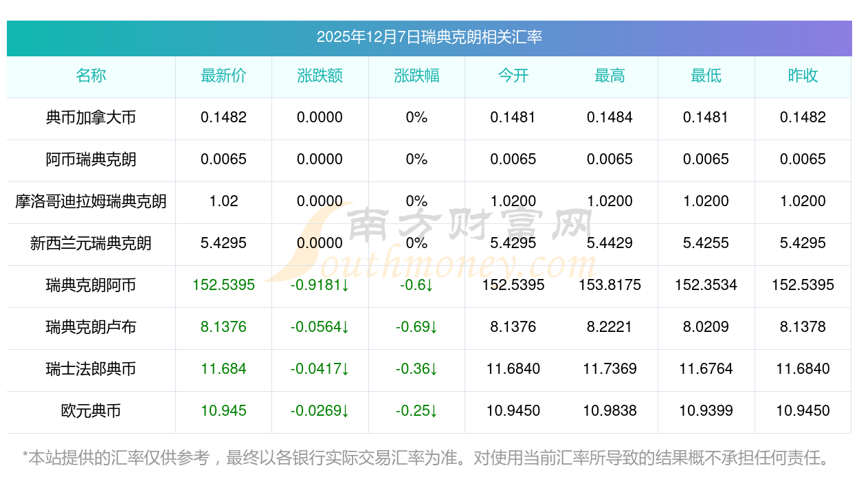 根据2025年12月7日汇率,瑞典克朗兑换挪币汇率最新1.075300,今开1.0753,昨收1.0753,最高1.0755,最低1.0716。
