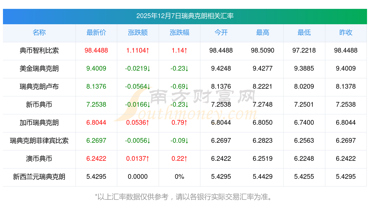 2025年12月7日瑞典克朗兑换兹罗提最新汇率:0.386400,今开:0.3864,昨收:0.3864,最高:0.3867,最低:0.3851。