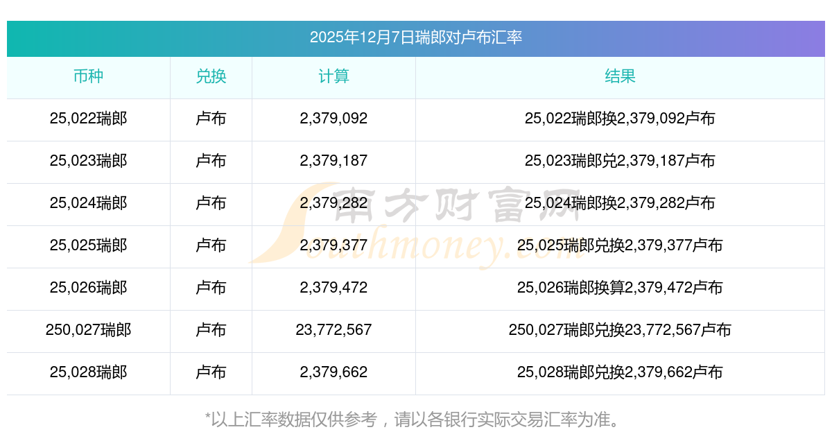 528瑞郎兑换卢布汇率查询(2025年12月7日)