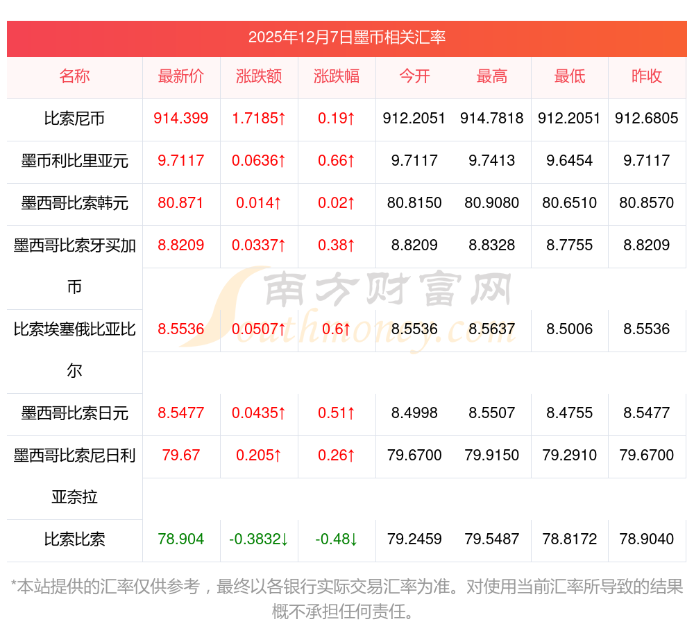 2025年12月7日墨币兑换肯尼亚先令最新汇率:7.114600,今开:7.0889,昨收:7.1146,最高:7.1230,最低:7.0889。