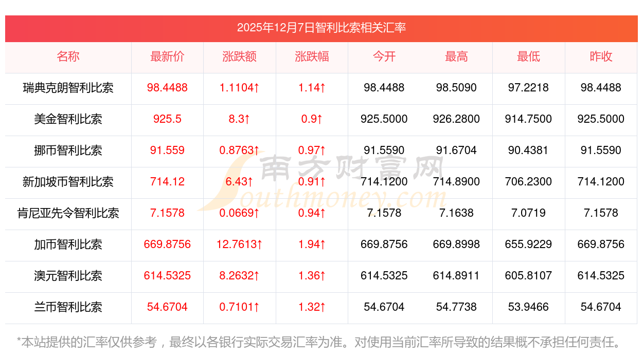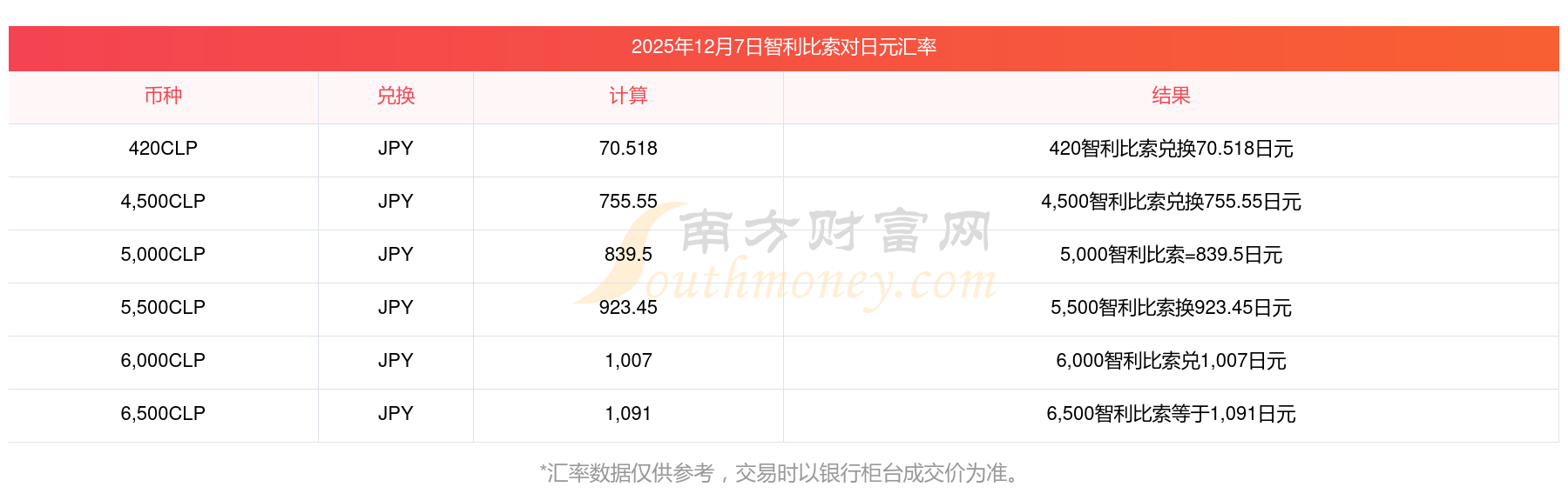 智利比索对日元今日最新汇率查询表12-7