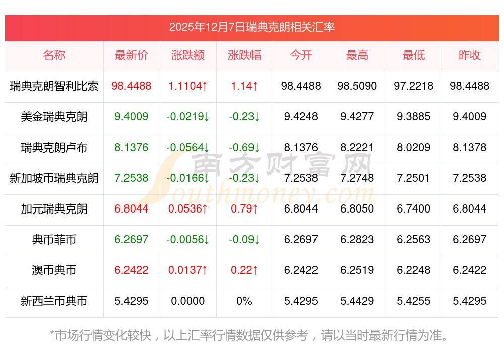 根据2025年12月7日汇率,瑞典克朗兑换港元汇率最新价0.828100,今开价0.8282,昨收价0.8281,最高价0.8293,最低价0.8255。